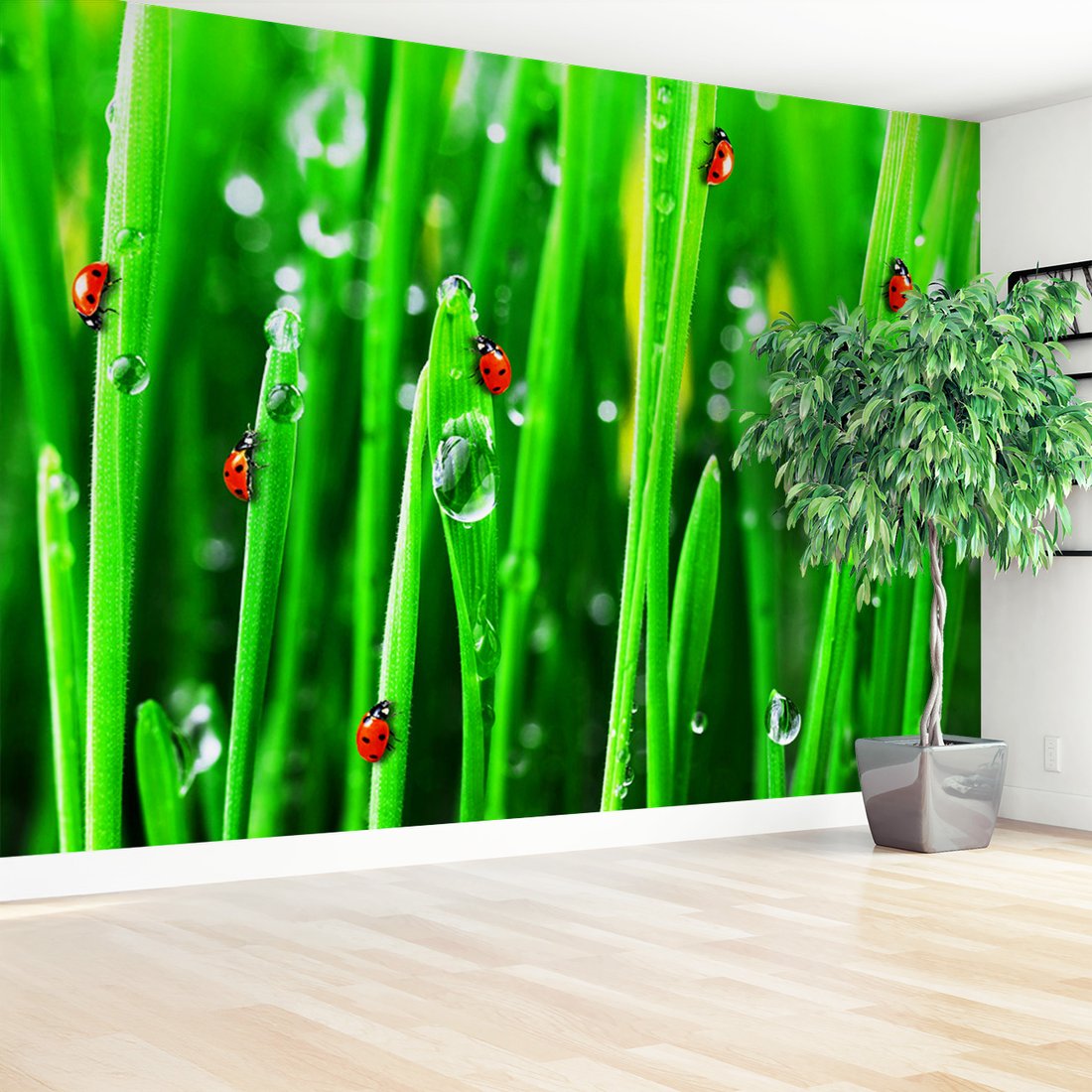 Nadaj swojemu wnętrzu unikalny charakter i głębię dzięki naszej fototapecie z motywem biedronki, trawa, krople. Ta imponująca dekoracja ścienna to połączenie nowoczesnego designu i zapierającego dech w piersiach motywu, które całkowicie odmieni Twoje pomieszczenie