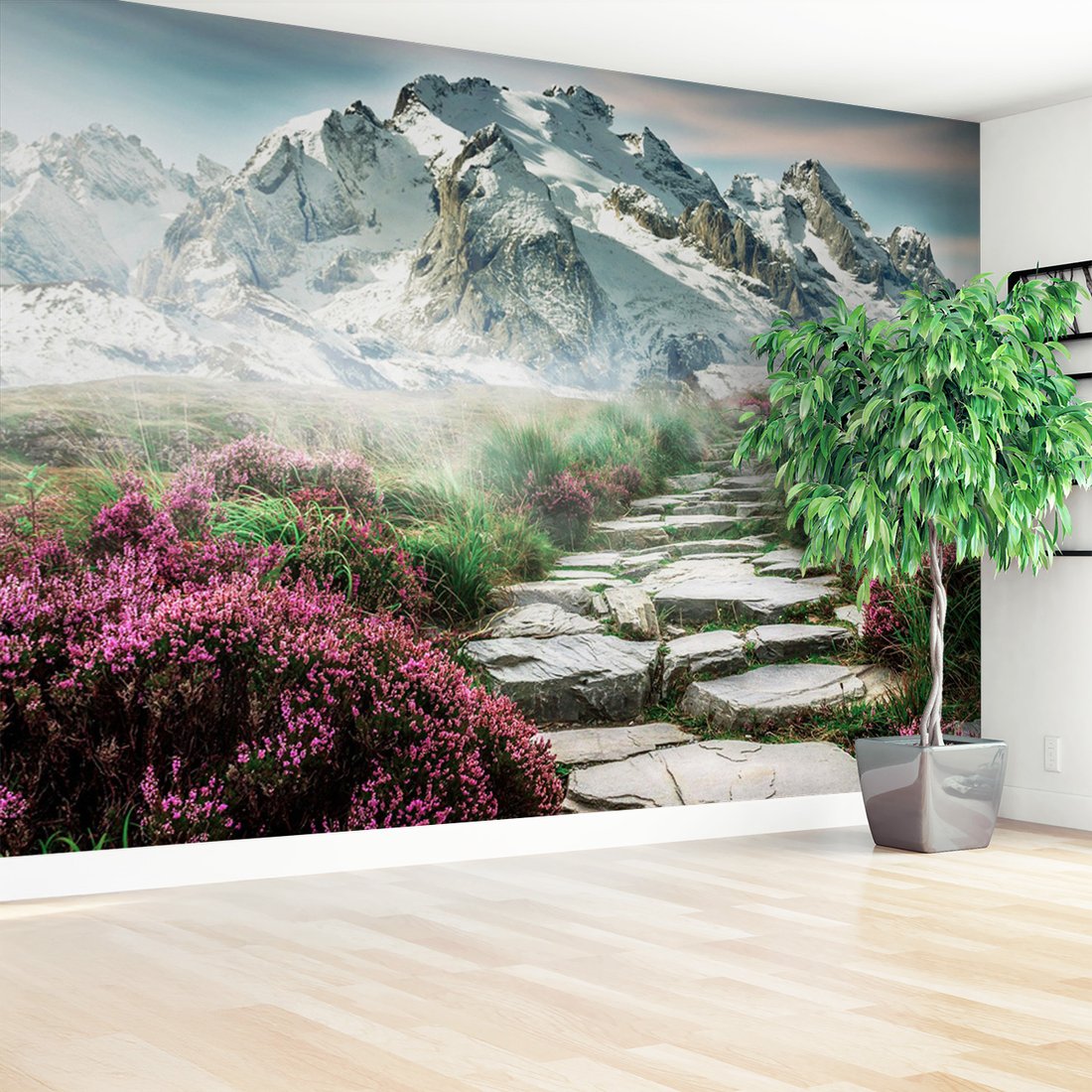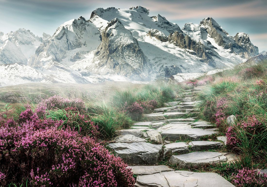 Nadaj swojemu wnętrzu unikalny charakter i głębię dzięki naszej fototapecie z motywem góry, kamienie, kwiaty. Ta imponująca dekoracja ścienna to połączenie nowoczesnego designu i zapierającego dech w piersiach motywu, które całkowicie odmieni Twoje pomieszczenie