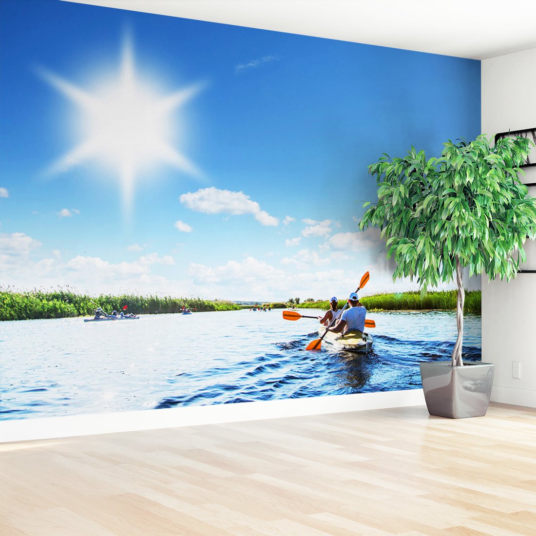 Nadaj swojemu wnętrzu unikalny charakter i głębię dzięki naszej fototapecie z motywem kajaki, woda, lato. Ta imponująca dekoracja ścienna to połączenie nowoczesnego designu i zapierającego dech w piersiach motywu, które całkowicie odmieni Twoje pomieszczenie