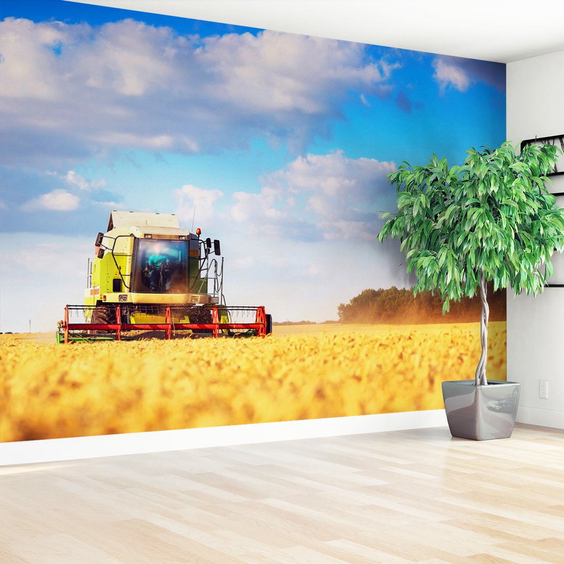 Nadaj swojemu wnętrzu unikalny charakter i głębię dzięki naszej fototapecie z motywem kombajn, zboże, pole. Ta imponująca dekoracja ścienna to połączenie nowoczesnego designu i zapierającego dech w piersiach motywu, które całkowicie odmieni Twoje pomieszczenie