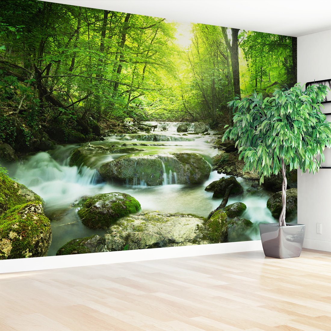 Nadaj swojemu wnętrzu unikalny charakter i głębię dzięki naszej fototapecie z motywem las, rzeka, wodospad. Ta imponująca dekoracja ścienna to połączenie nowoczesnego designu i zapierającego dech w piersiach motywu, które całkowicie odmieni Twoje pomieszczenie