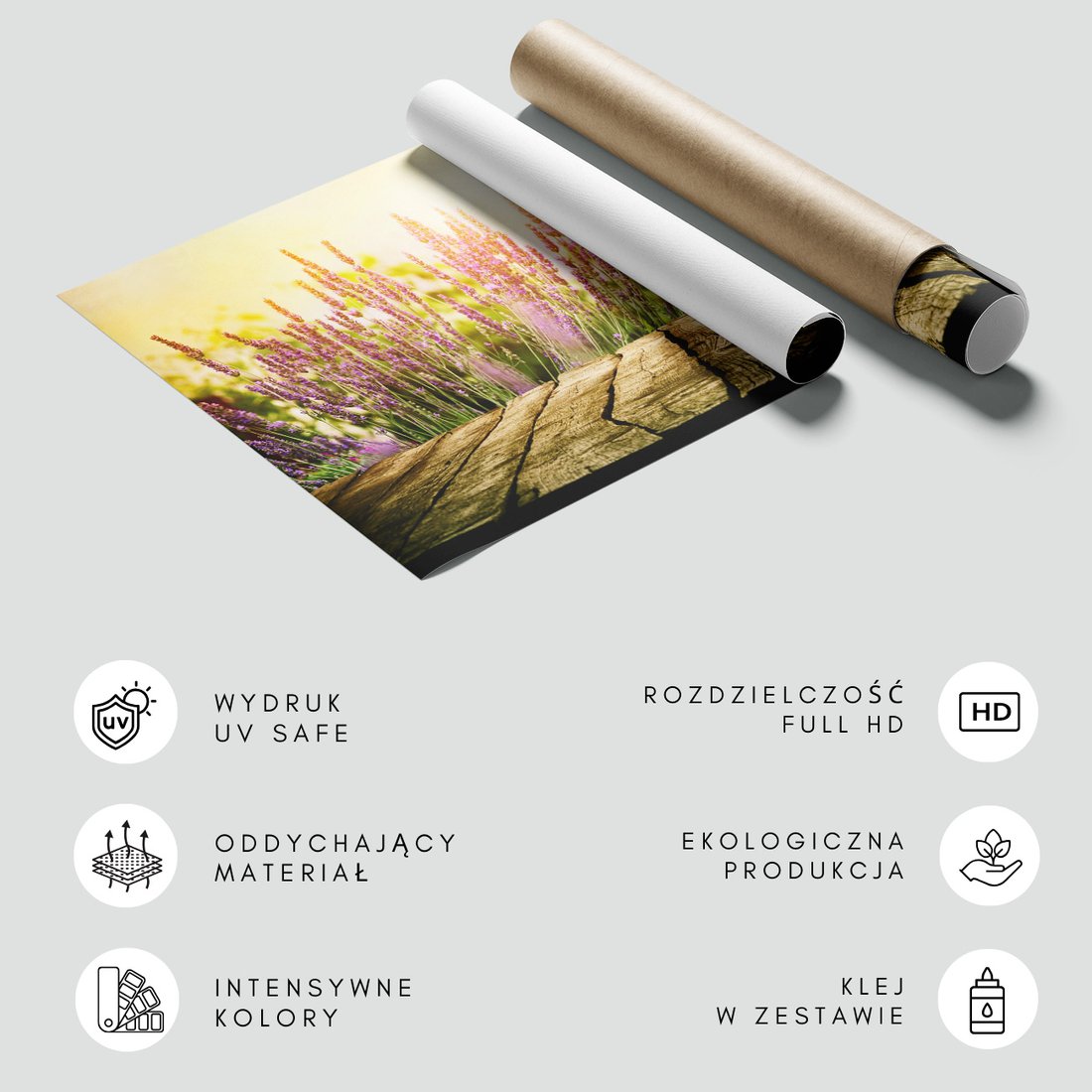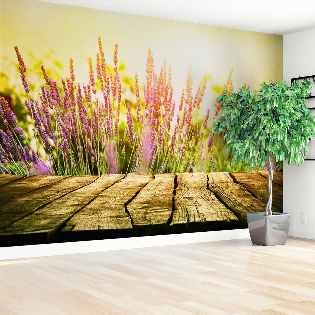 Nadaj swojemu wnętrzu unikalny charakter i głębię dzięki naszej fototapecie z motywem lawenda, kwiaty, drewno. Ta imponująca dekoracja ścienna to połączenie nowoczesnego designu i zapierającego dech w piersiach motywu, które całkowicie odmieni Twoje pomieszczenie