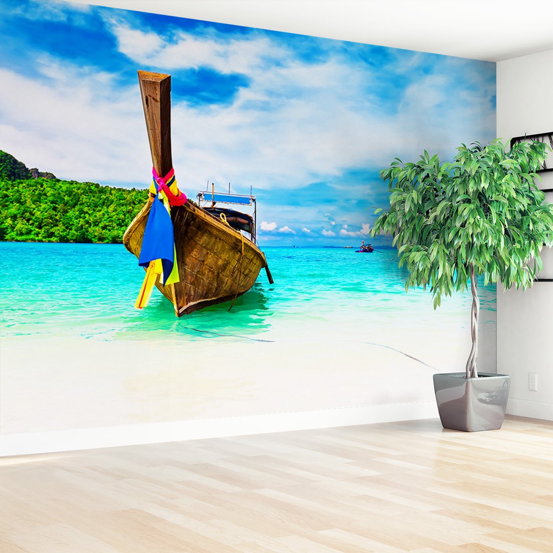 Nadaj swojemu wnętrzu unikalny charakter i głębię dzięki naszej fototapecie z motywem łódź, plaża, morze. Ta imponująca dekoracja ścienna to połączenie nowoczesnego designu i zapierającego dech w piersiach motywu, które całkowicie odmieni Twoje pomieszczenie