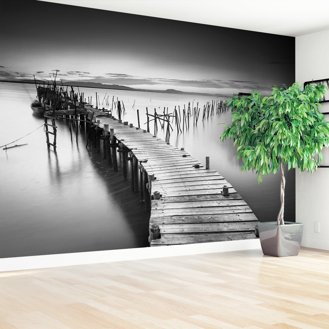 Nadaj swojemu wnętrzu unikalny charakter i głębię dzięki naszej fototapecie z motywem pomost, woda, krajobraz. Ta imponująca dekoracja ścienna to połączenie nowoczesnego designu i zapierającego dech w piersiach motywu, które całkowicie odmieni Twoje pomieszczenie