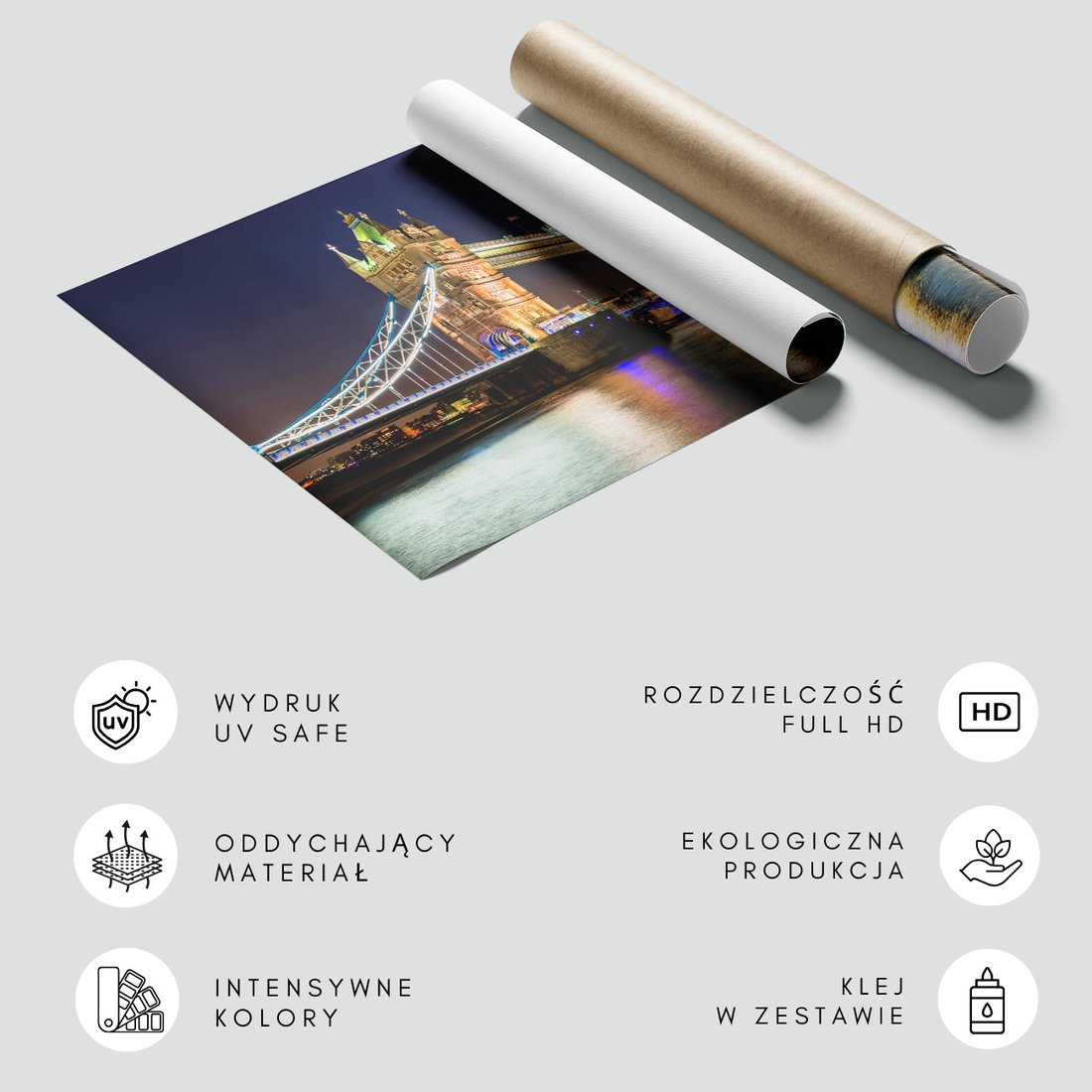 Nadaj swojemu wnętrzu unikalny charakter i głębię dzięki naszej fototapecie z motywem tower bridge, Londyn, noc. Ta imponująca dekoracja ścienna to połączenie nowoczesnego designu i zapierającego dech w piersiach motywu, które całkowicie odmieni Twoje pomieszczenie