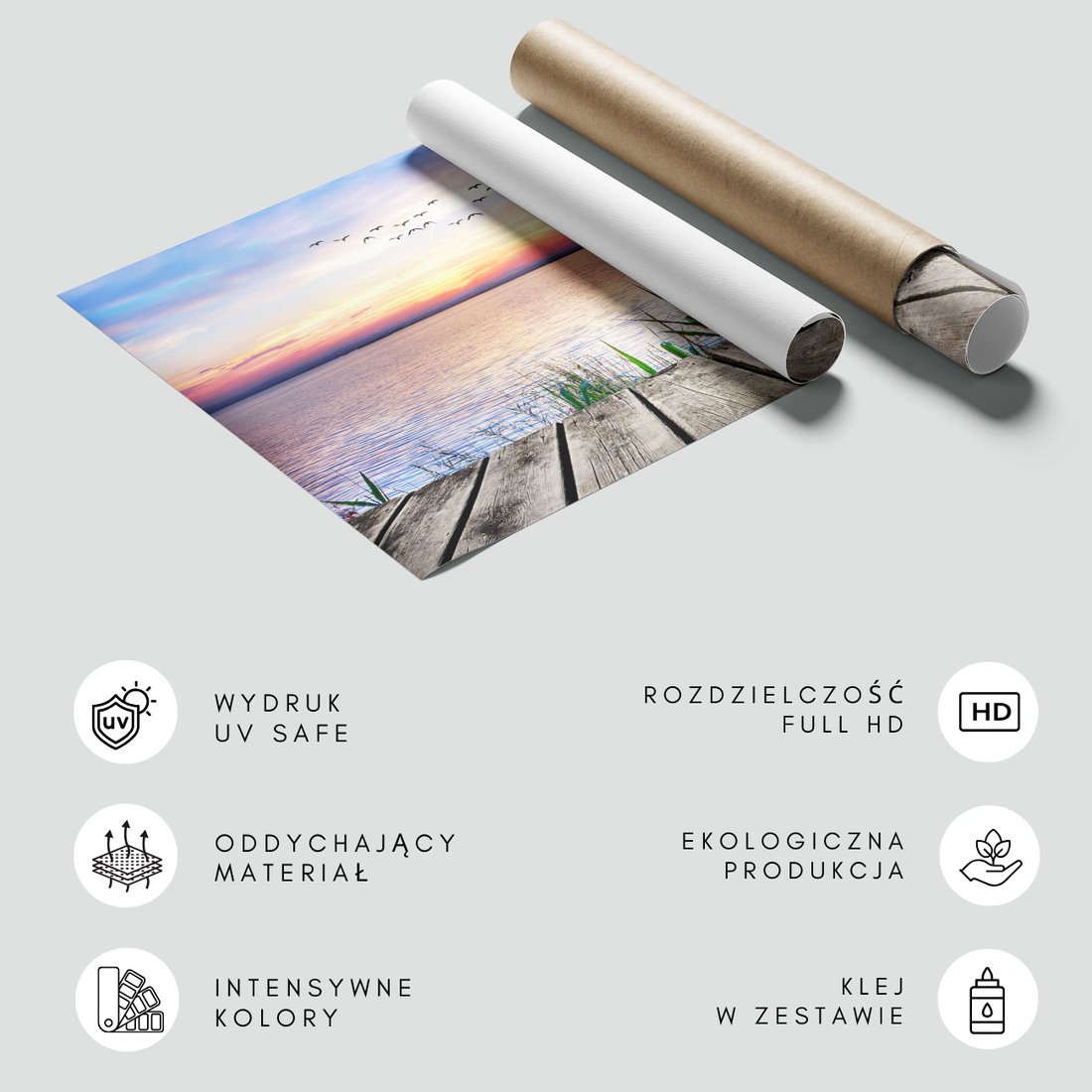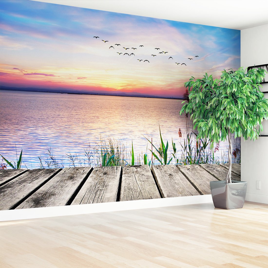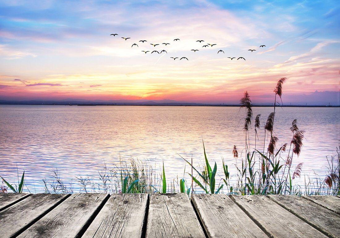 Nadaj swojemu wnętrzu unikalny charakter i głębię dzięki naszej fototapecie z motywem zachód słońca, jezioro, ptaki. Ta imponująca dekoracja ścienna to połączenie nowoczesnego designu i zapierającego dech w piersiach motywu, które całkowicie odmieni Twoje pomieszczenie