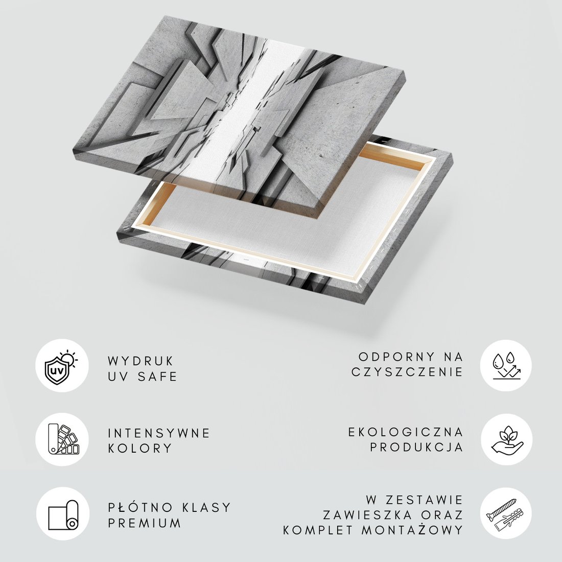 Obraz na płótnie z motywem abstrakcja, beton, geometria to kwintesencja estetyki i trwałości. Dzięki łatwemu montażowi i uniwersalnemu wzornictwu, czyni go idealnym wyborem zarówno do codziennego użytku, jak i na wyrafinowany prezent.