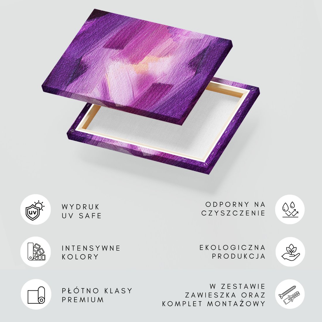 Obraz na płótnie z motywem abstrakcja, fiolet, tekstura to kwintesencja estetyki i trwałości. Dzięki łatwemu montażowi i uniwersalnemu wzornictwu, czyni go idealnym wyborem zarówno do codziennego użytku, jak i na wyrafinowany prezent.