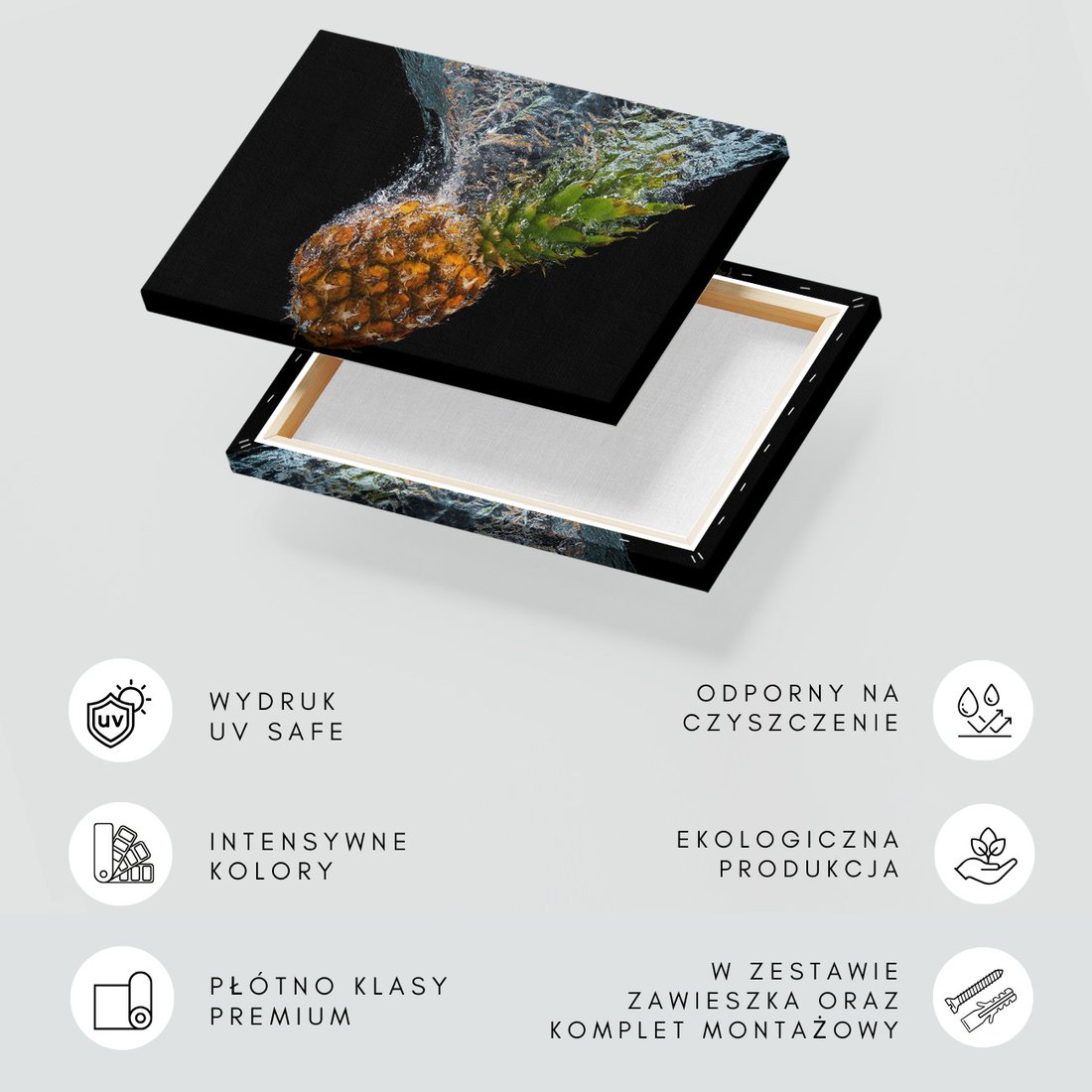 Obraz na płótnie z motywem ananas, woda, owoce to kwintesencja estetyki i trwałości. Dzięki łatwemu montażowi i uniwersalnemu wzornictwu, czyni go idealnym wyborem zarówno do codziennego użytku, jak i na wyrafinowany prezent.