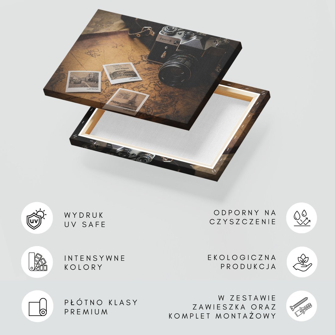 Obraz na płótnie z motywem aparat, vintage, zdjęcia to kwintesencja estetyki i trwałości. Dzięki łatwemu montażowi i uniwersalnemu wzornictwu, czyni go idealnym wyborem zarówno do codziennego użytku, jak i na wyrafinowany prezent.