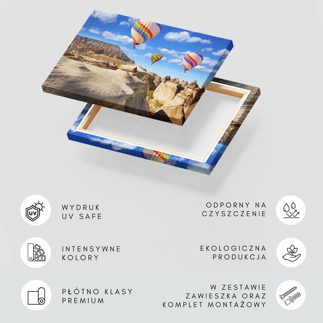 Obraz na płótnie z motywem balony, krajobraz, Kapadocja to kwintesencja estetyki i trwałości. Dzięki łatwemu montażowi i uniwersalnemu wzornictwu, czyni go idealnym wyborem zarówno do codziennego użytku, jak i na wyrafinowany prezent.