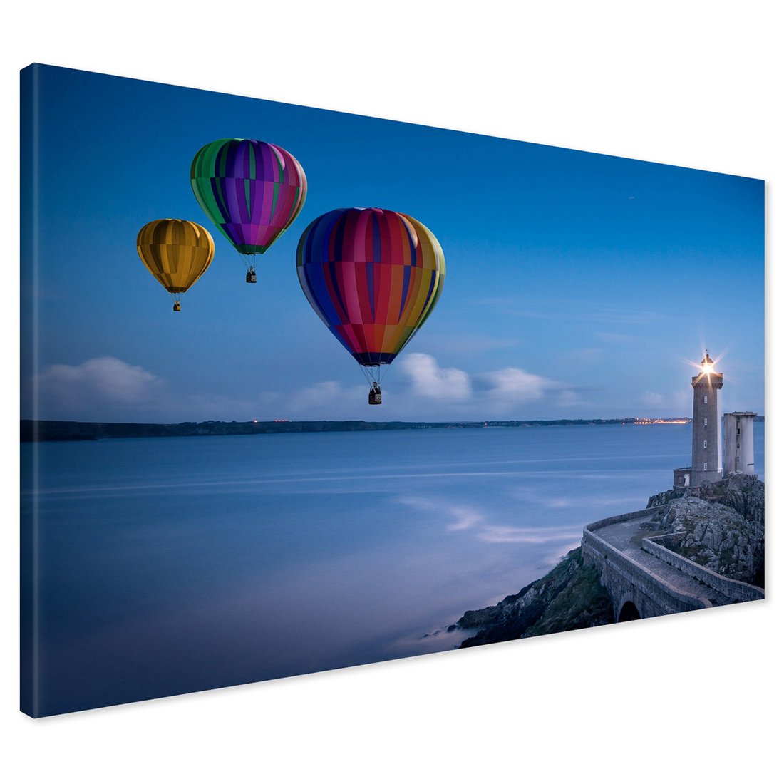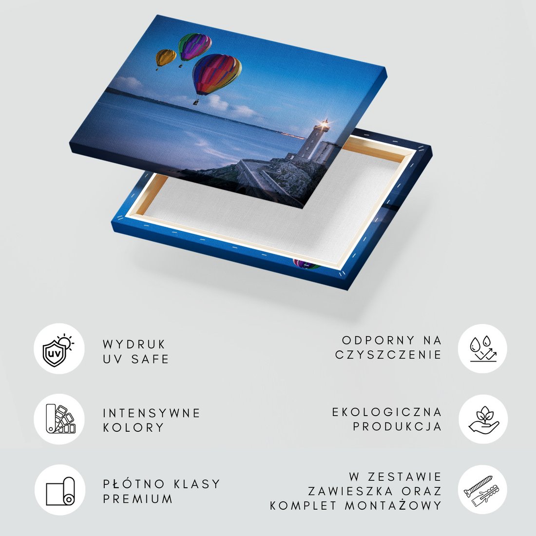 Obraz na płótnie z motywem balony, latarnia, morze to kwintesencja estetyki i trwałości. Dzięki łatwemu montażowi i uniwersalnemu wzornictwu, czyni go idealnym wyborem zarówno do codziennego użytku, jak i na wyrafinowany prezent.