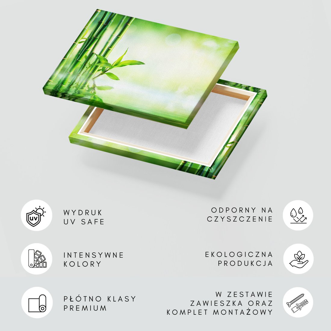 Obraz na płótnie z motywem bambus, woda, liście to kwintesencja estetyki i trwałości. Dzięki łatwemu montażowi i uniwersalnemu wzornictwu, czyni go idealnym wyborem zarówno do codziennego użytku, jak i na wyrafinowany prezent.