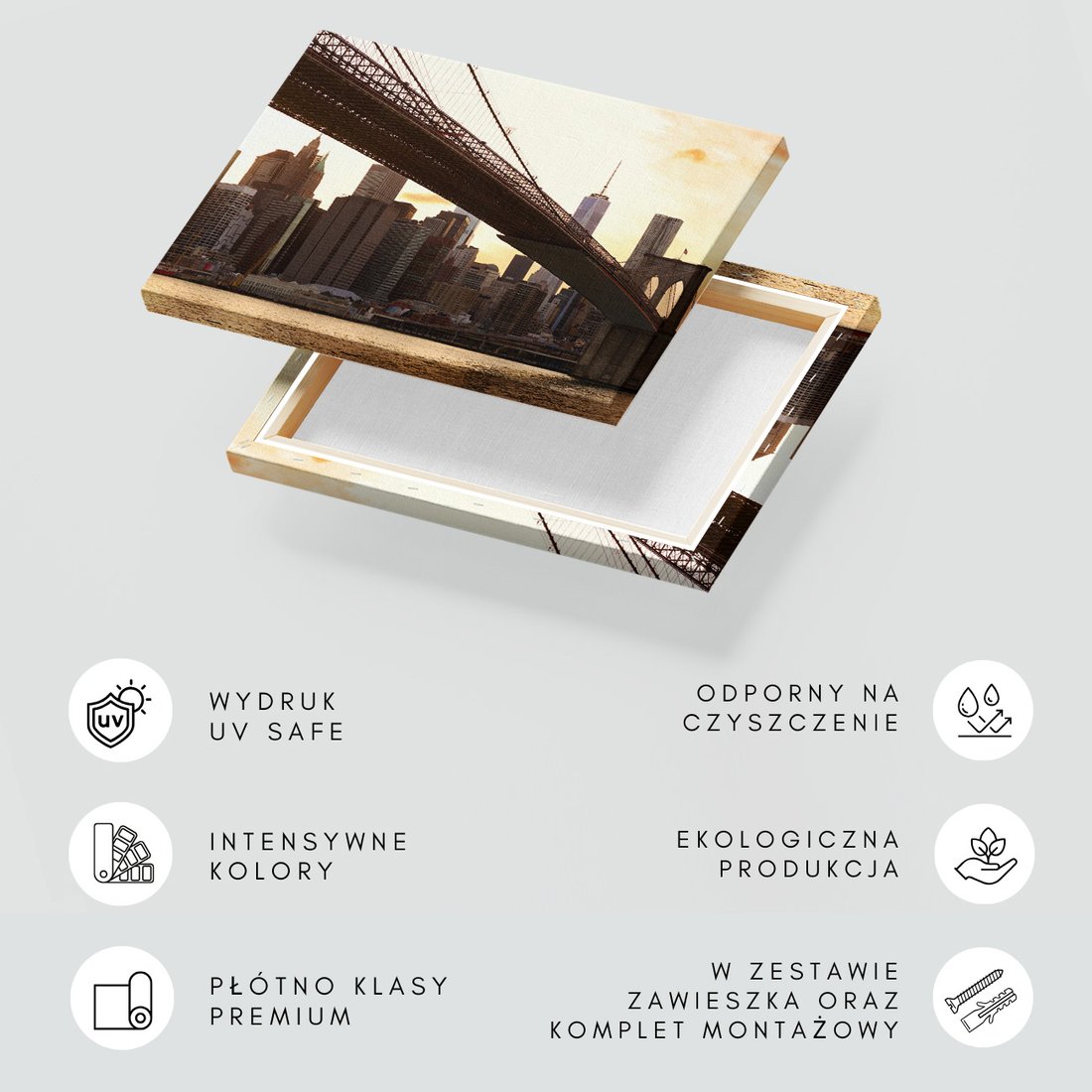Obraz na płótnie z motywem Brooklyn Bridge, miasto, woda to kwintesencja estetyki i trwałości. Dzięki łatwemu montażowi i uniwersalnemu wzornictwu, czyni go idealnym wyborem zarówno do codziennego użytku, jak i na wyrafinowany prezent.