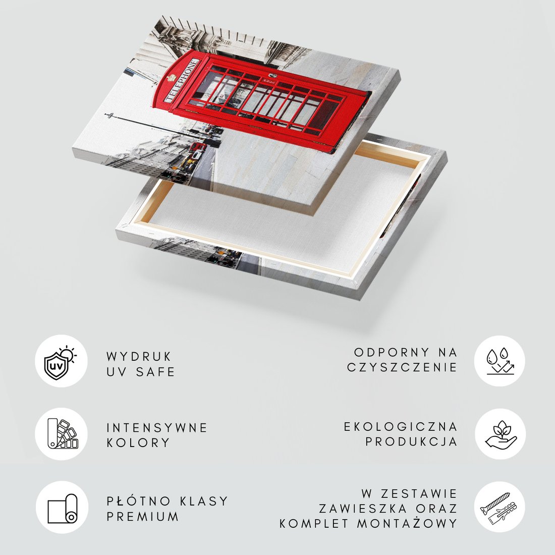 Obraz na płótnie z motywem budka telefoniczna, Londyn, miasto to kwintesencja estetyki i trwałości. Dzięki łatwemu montażowi i uniwersalnemu wzornictwu, czyni go idealnym wyborem zarówno do codziennego użytku, jak i na wyrafinowany prezent.