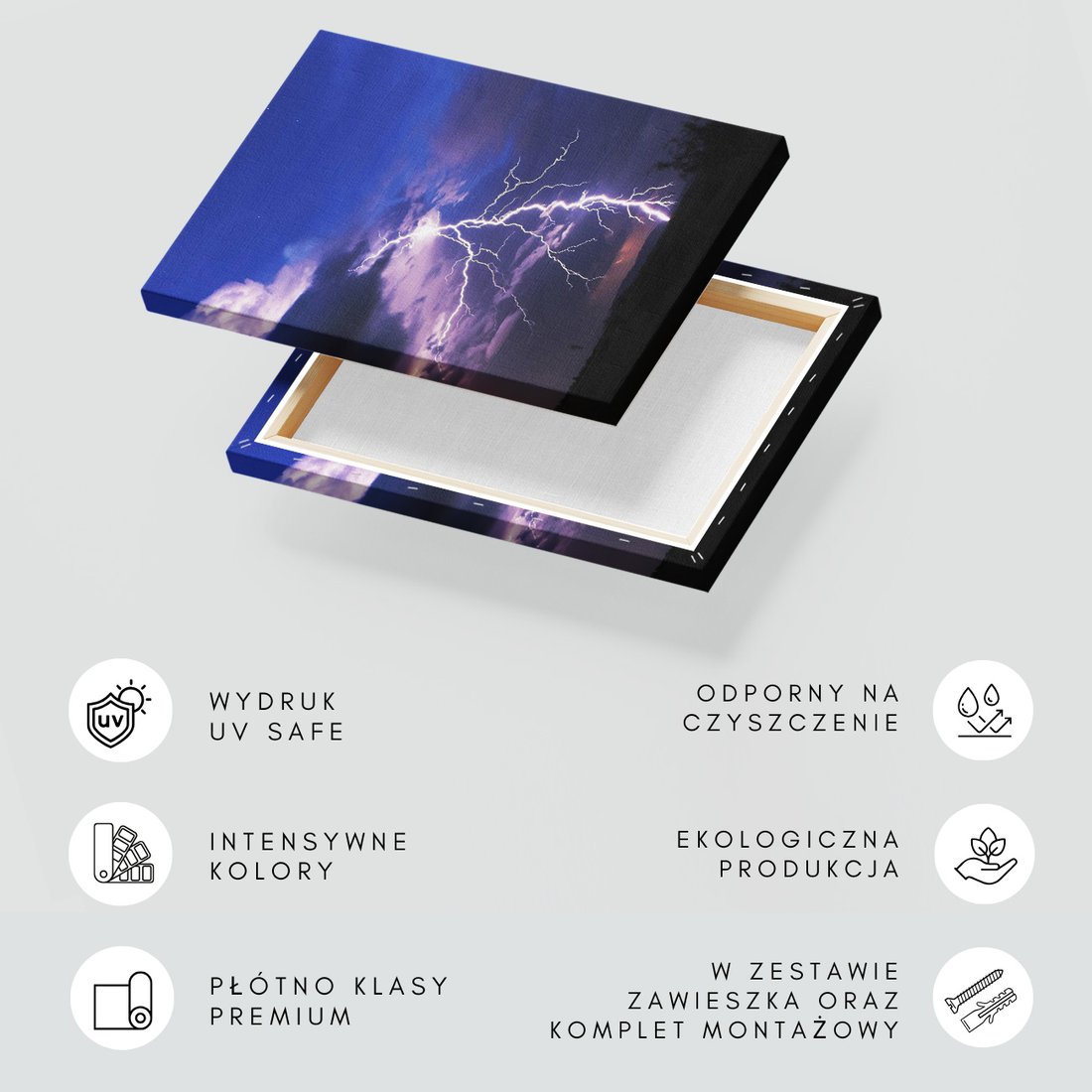 Obraz na płótnie z motywem burza, piorun, noc to kwintesencja estetyki i trwałości. Dzięki łatwemu montażowi i uniwersalnemu wzornictwu, czyni go idealnym wyborem zarówno do codziennego użytku, jak i na wyrafinowany prezent.