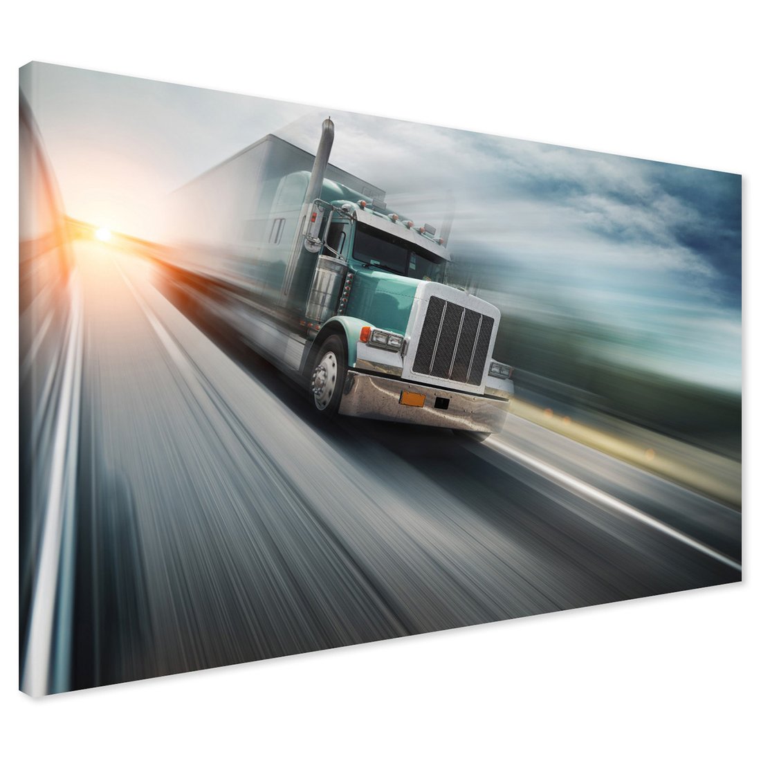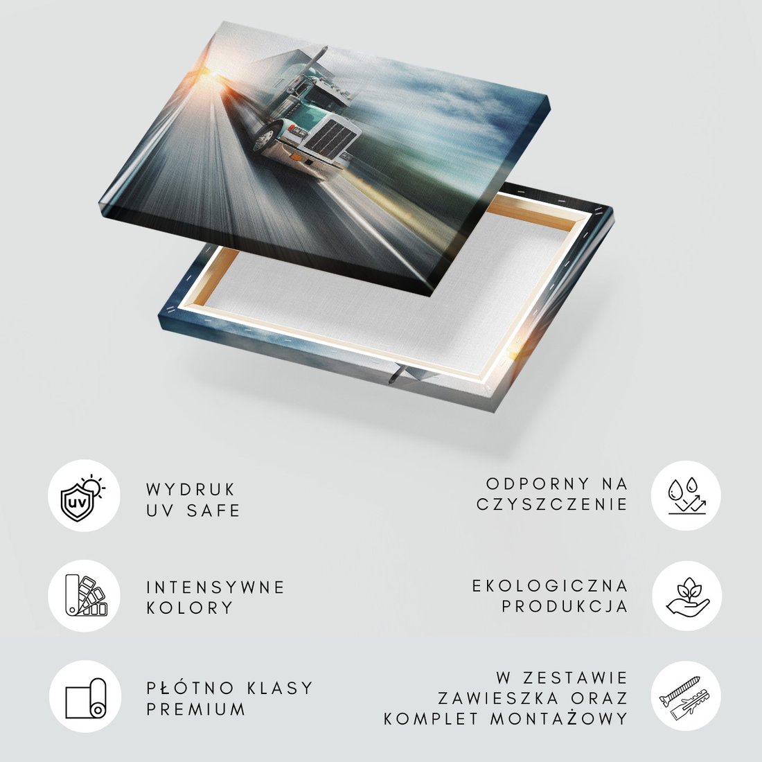 Obraz na płótnie z motywem ciężarówka, transport, droga to kwintesencja estetyki i trwałości. Dzięki łatwemu montażowi i uniwersalnemu wzornictwu, czyni go idealnym wyborem zarówno do codziennego użytku, jak i na wyrafinowany prezent.