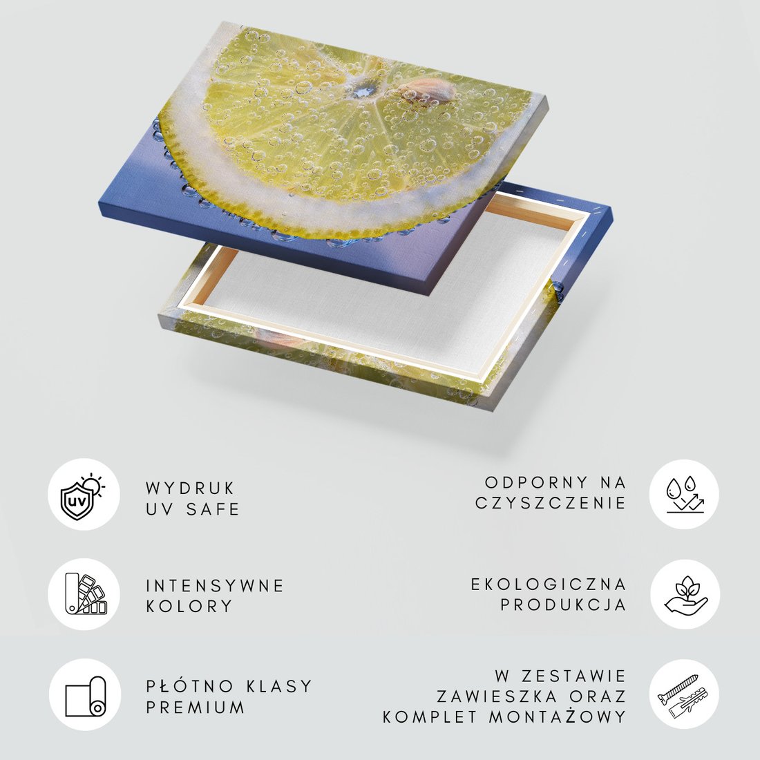 Obraz na płótnie z motywem cytryna, bąbelki, napój to kwintesencja estetyki i trwałości. Dzięki łatwemu montażowi i uniwersalnemu wzornictwu, czyni go idealnym wyborem zarówno do codziennego użytku, jak i na wyrafinowany prezent.