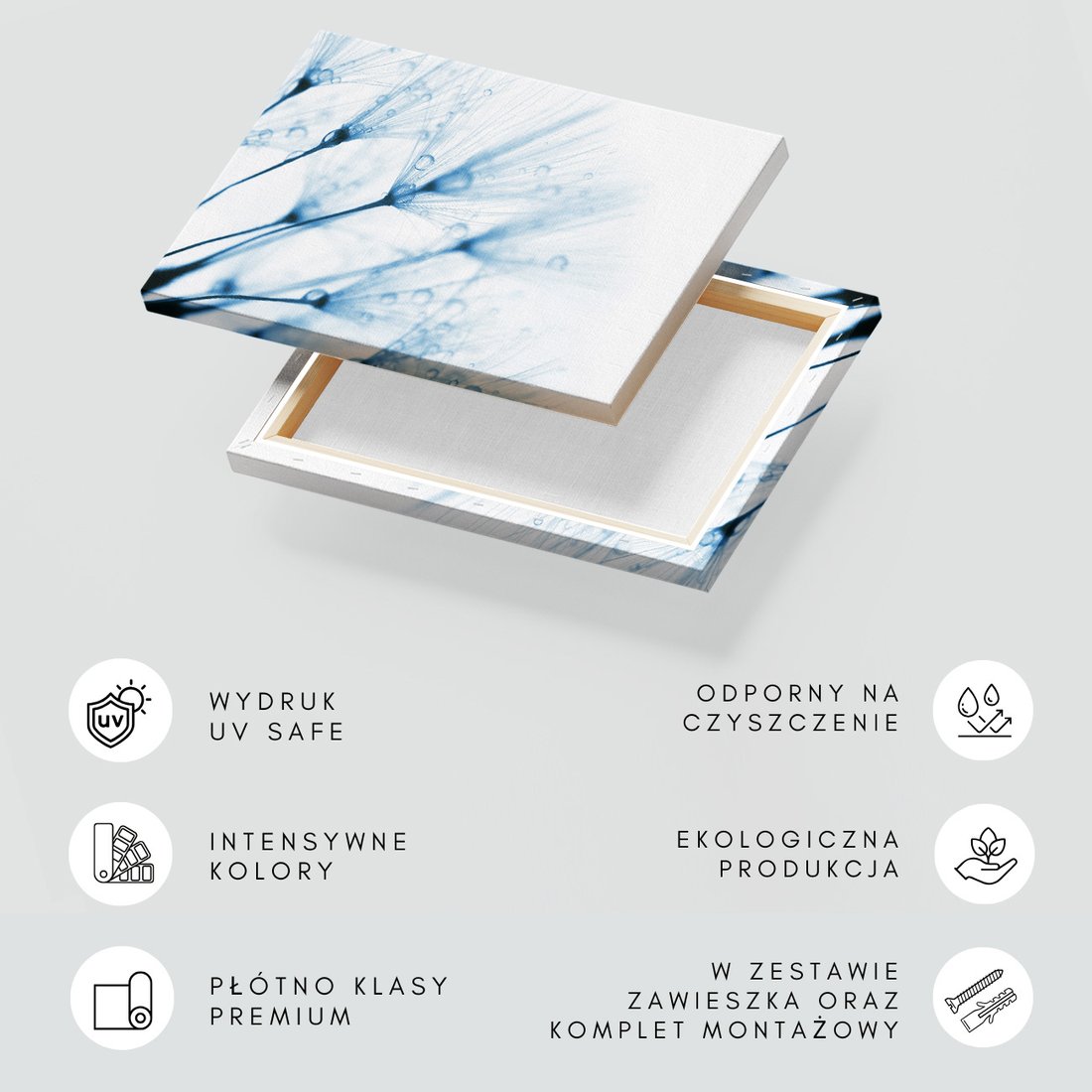 Obraz na płótnie z motywem dmuchawiec, krople, natura to kwintesencja estetyki i trwałości. Dzięki łatwemu montażowi i uniwersalnemu wzornictwu, czyni go idealnym wyborem zarówno do codziennego użytku, jak i na wyrafinowany prezent.