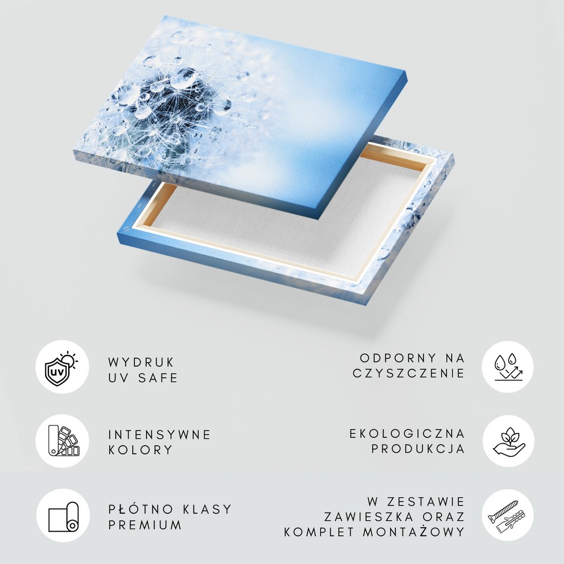 Obraz na płótnie z motywem dmuchawiec, krople, natura to kwintesencja estetyki i trwałości. Dzięki łatwemu montażowi i uniwersalnemu wzornictwu, czyni go idealnym wyborem zarówno do codziennego użytku, jak i na wyrafinowany prezent.