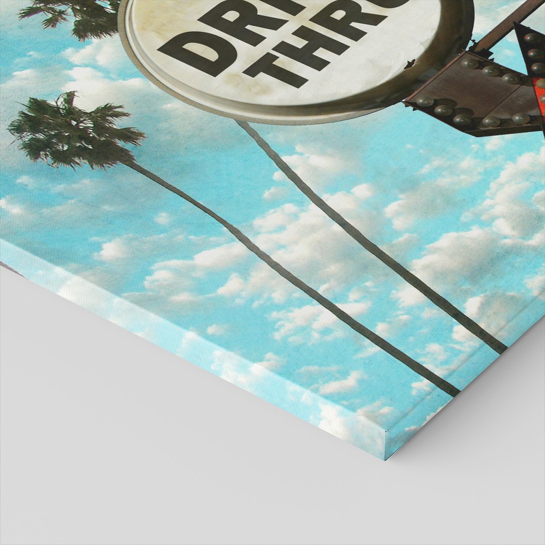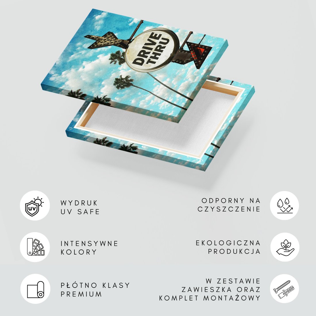 Obraz na płótnie z motywem drive thru, palma, znak to kwintesencja estetyki i trwałości. Dzięki łatwemu montażowi i uniwersalnemu wzornictwu, czyni go idealnym wyborem zarówno do codziennego użytku, jak i na wyrafinowany prezent.