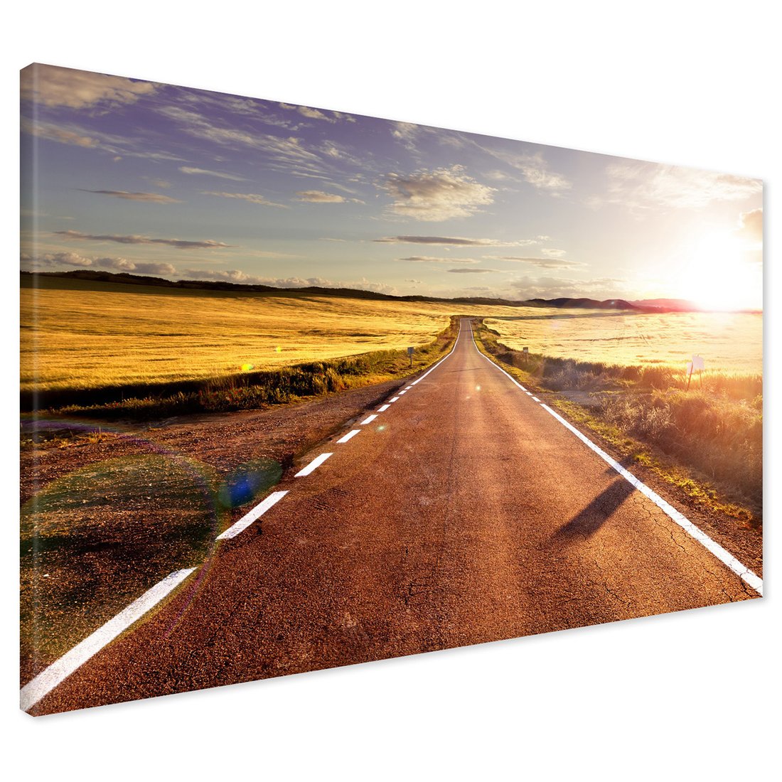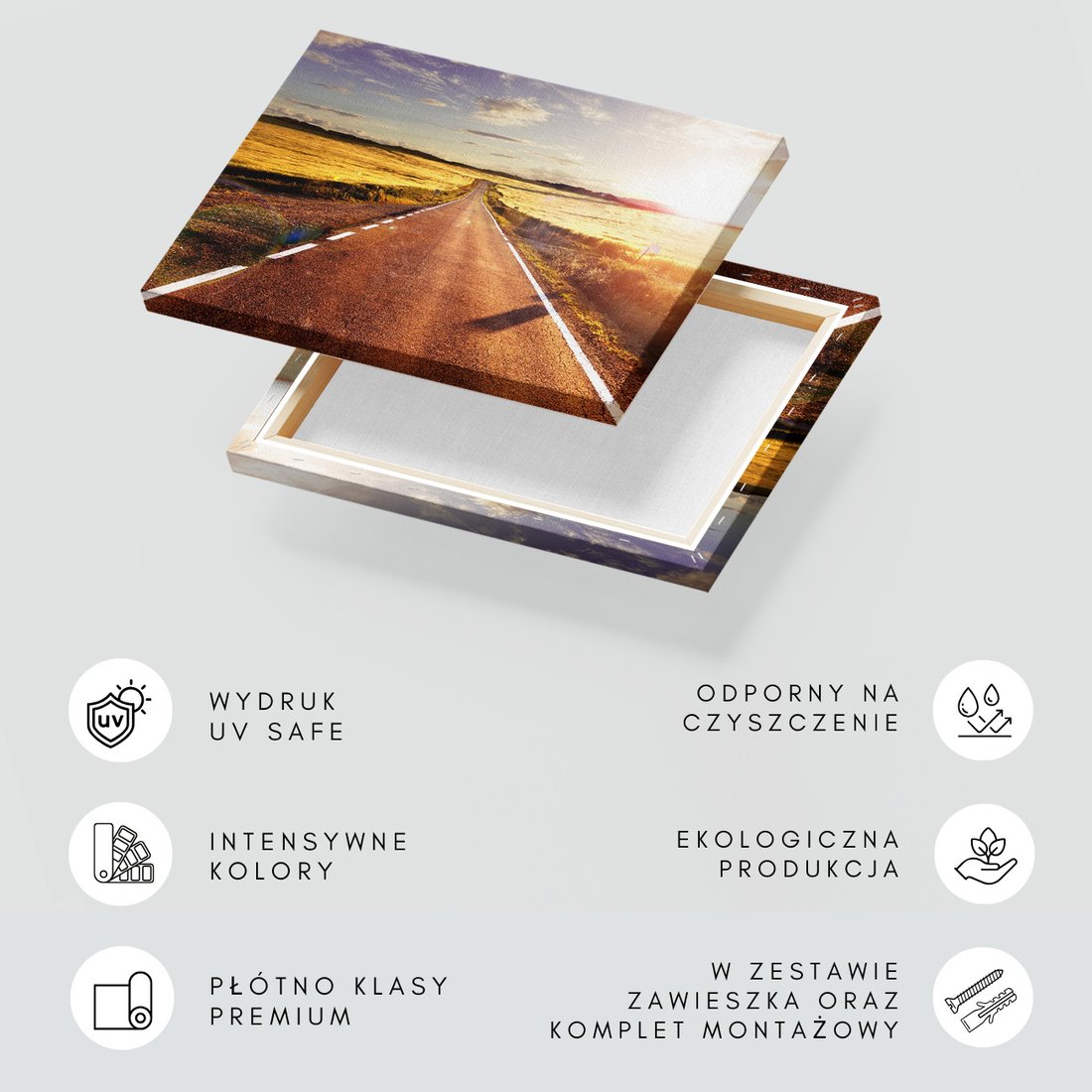 Obraz na płótnie z motywem droga, krajobraz, słońce to kwintesencja estetyki i trwałości. Dzięki łatwemu montażowi i uniwersalnemu wzornictwu, czyni go idealnym wyborem zarówno do codziennego użytku, jak i na wyrafinowany prezent.
