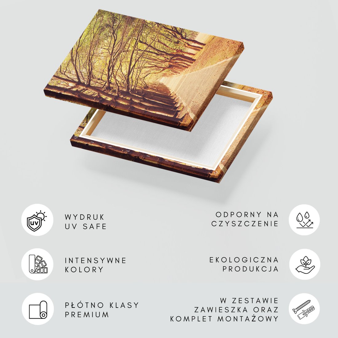 Obraz na płótnie z motywem drzewa, ścieżka, aleja to kwintesencja estetyki i trwałości. Dzięki łatwemu montażowi i uniwersalnemu wzornictwu, czyni go idealnym wyborem zarówno do codziennego użytku, jak i na wyrafinowany prezent.