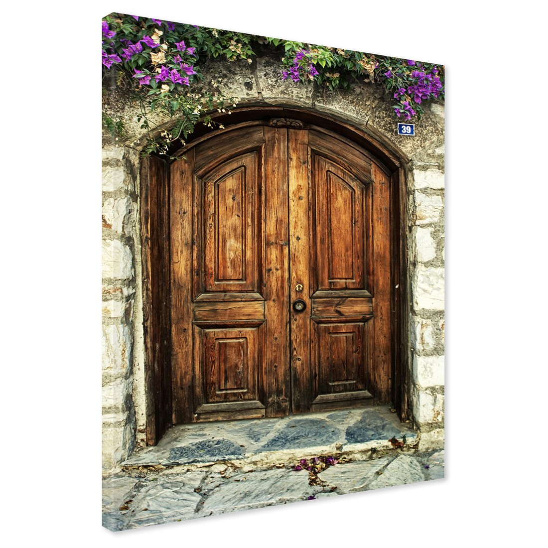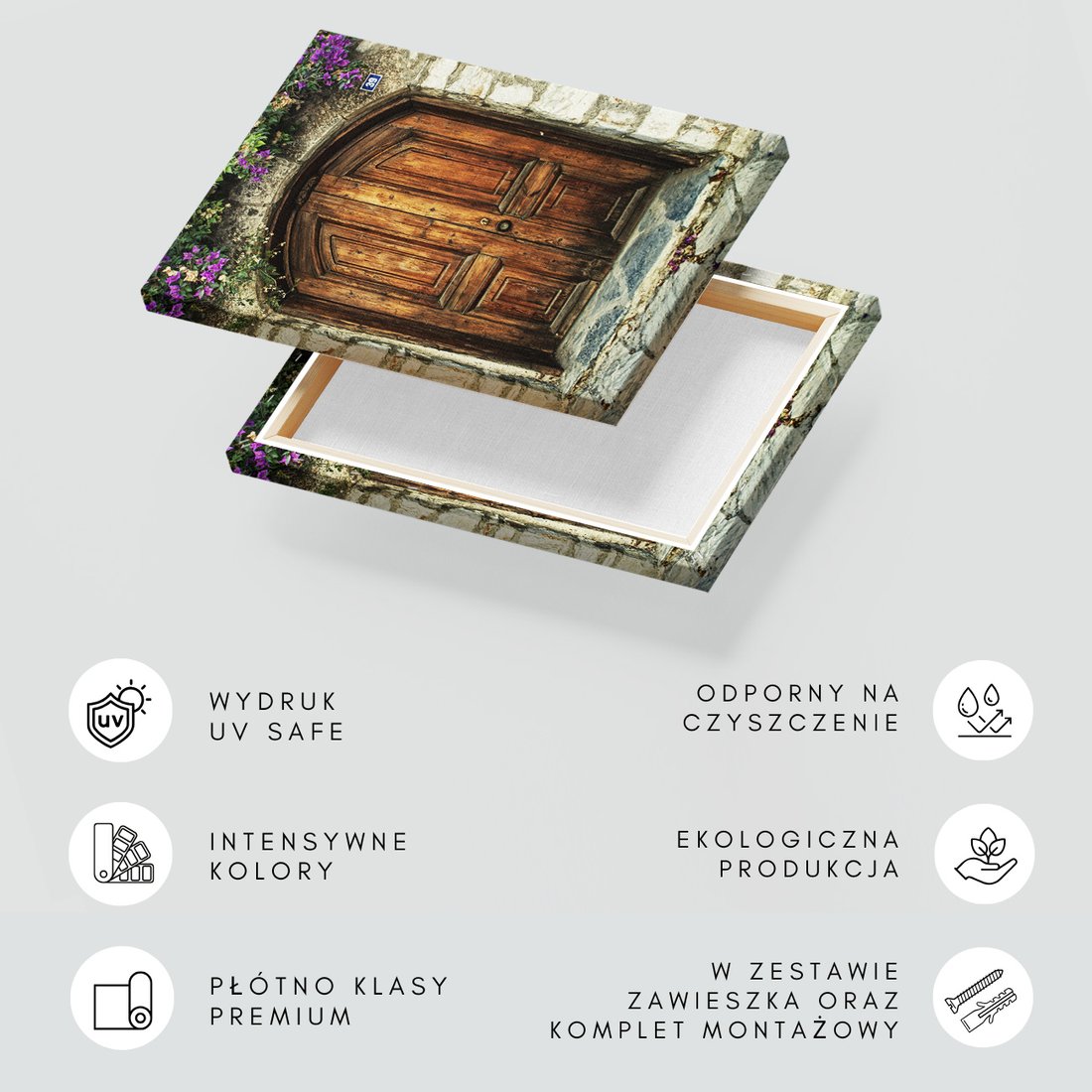 Obraz na płótnie z motywem drzwi, kwiaty, kamień to kwintesencja estetyki i trwałości. Dzięki łatwemu montażowi i uniwersalnemu wzornictwu, czyni go idealnym wyborem zarówno do codziennego użytku, jak i na wyrafinowany prezent.