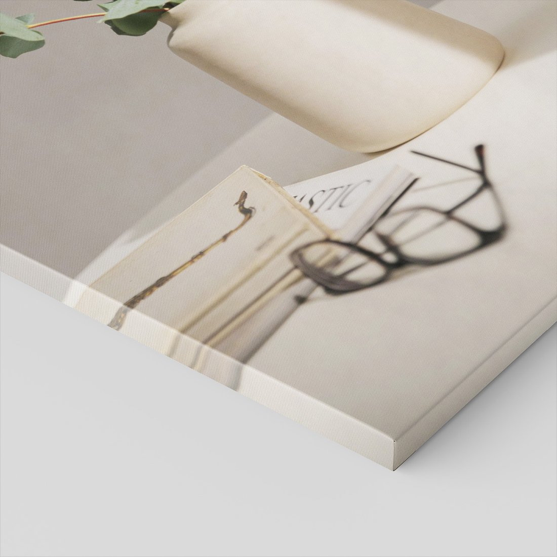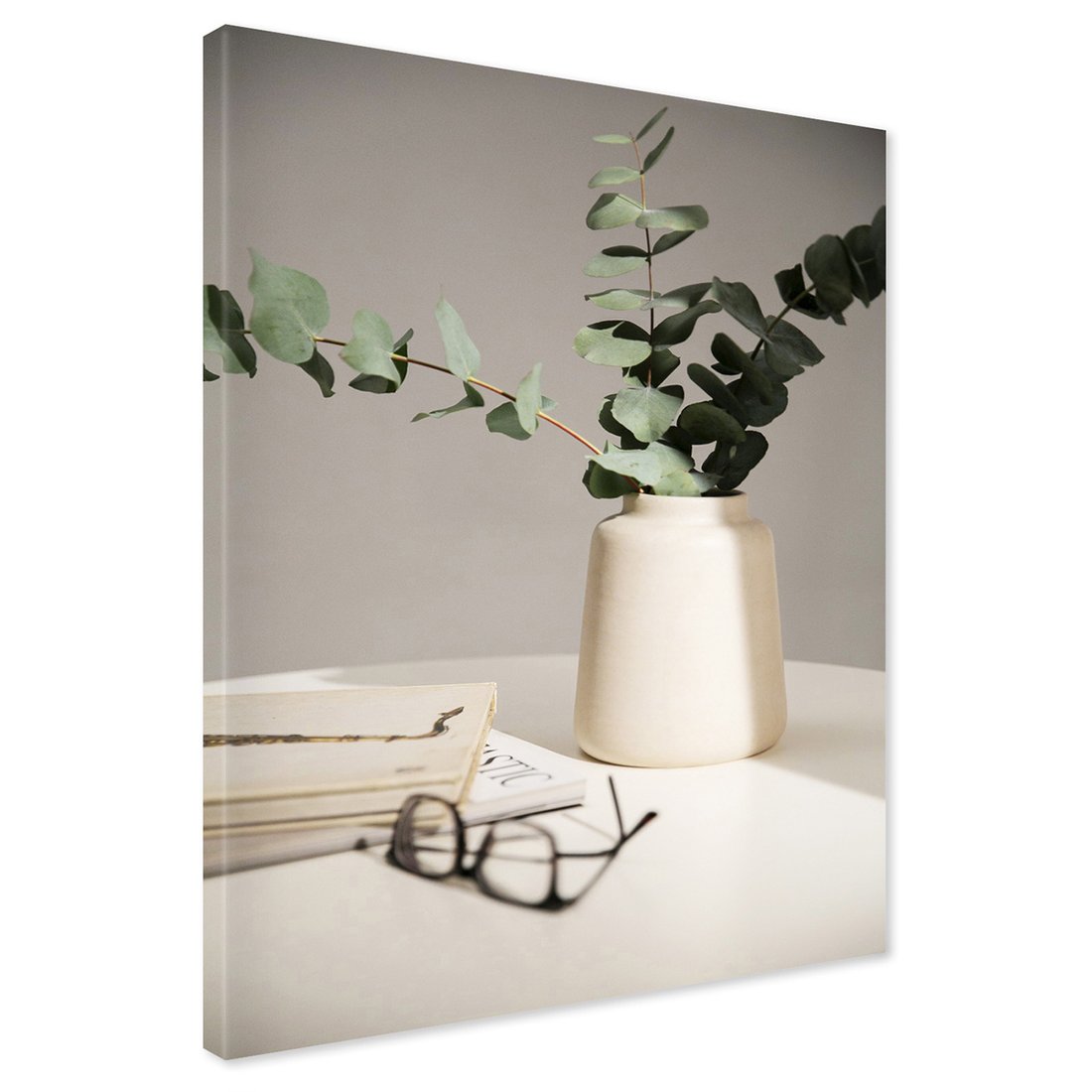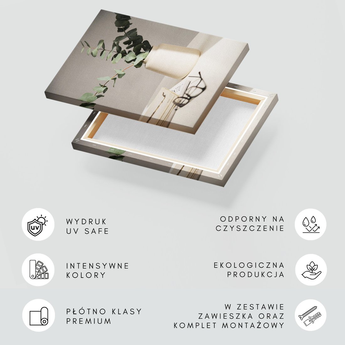 Obraz na płótnie z motywem eukaliptus, wazon, książki to kwintesencja estetyki i trwałości. Dzięki łatwemu montażowi i uniwersalnemu wzornictwu, czyni go idealnym wyborem zarówno do codziennego użytku, jak i na wyrafinowany prezent.