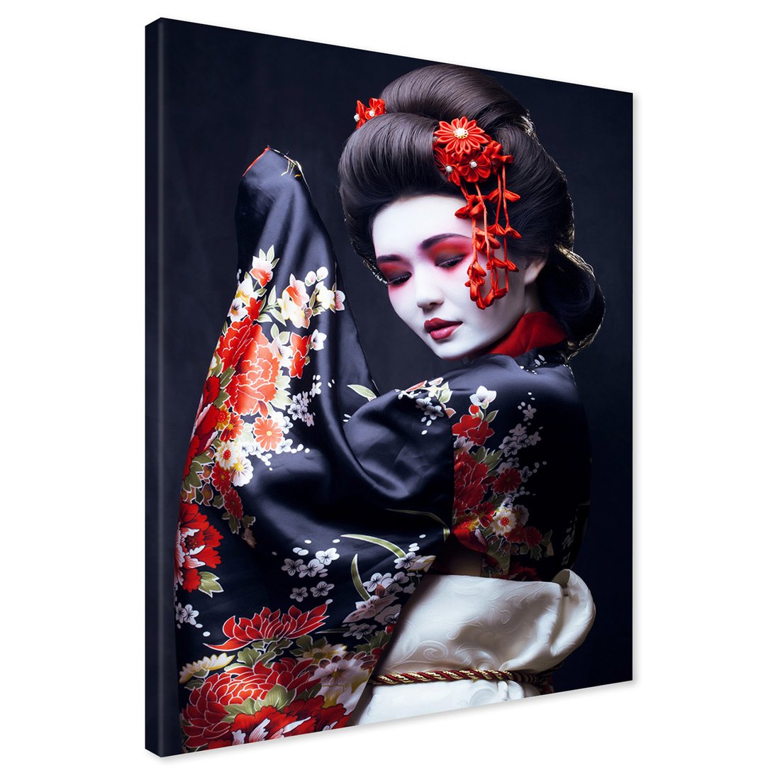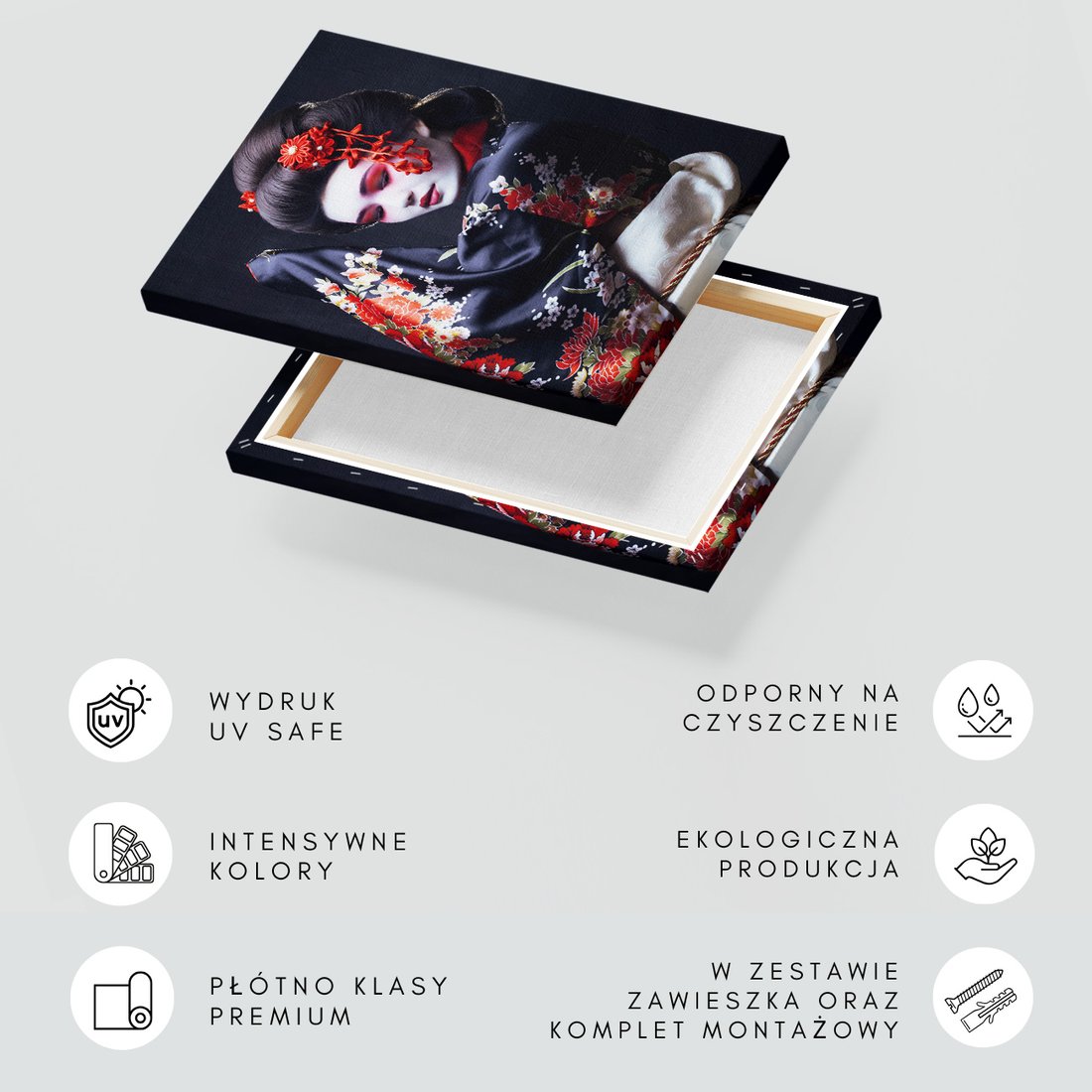 Obraz na płótnie z motywem gejsza, kwiaty, kimono to kwintesencja estetyki i trwałości. Dzięki łatwemu montażowi i uniwersalnemu wzornictwu, czyni go idealnym wyborem zarówno do codziennego użytku, jak i na wyrafinowany prezent.
