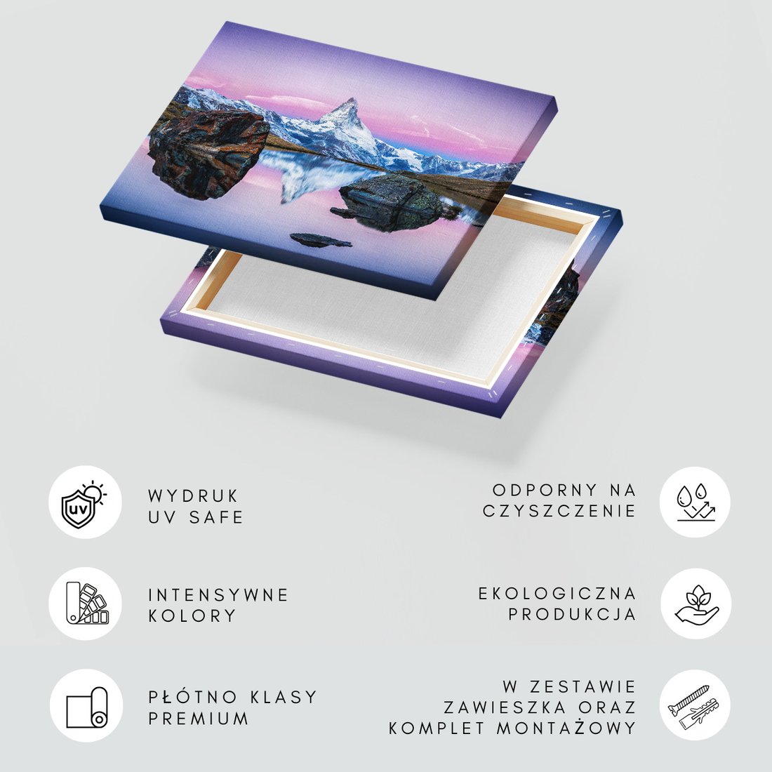 Obraz na płótnie z motywem góry, jezioro, odbicie to kwintesencja estetyki i trwałości. Dzięki łatwemu montażowi i uniwersalnemu wzornictwu, czyni go idealnym wyborem zarówno do codziennego użytku, jak i na wyrafinowany prezent.