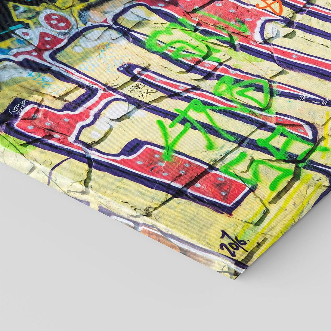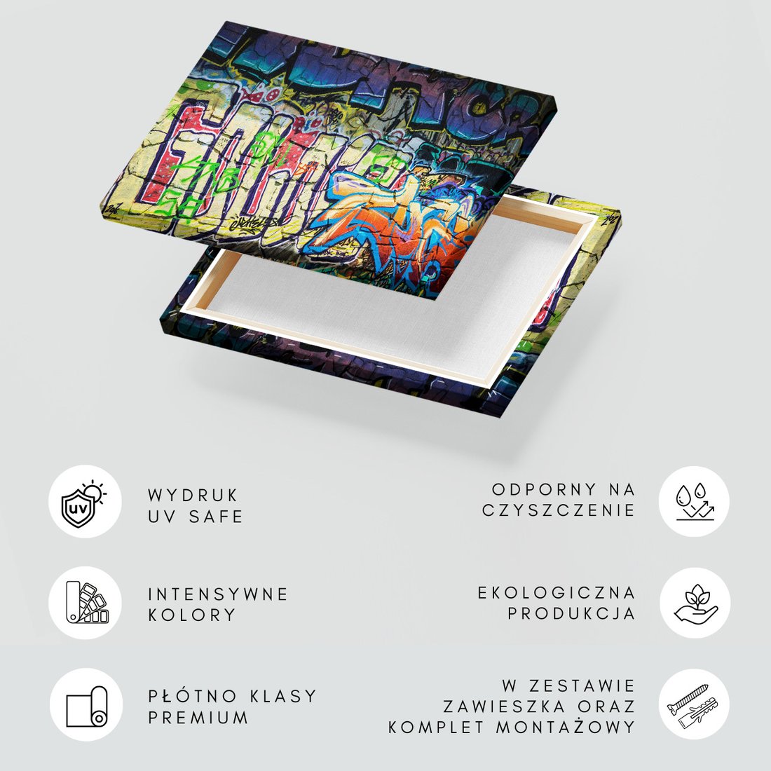 Obraz na płótnie z motywem graffiti, mur, sztuka to kwintesencja estetyki i trwałości. Dzięki łatwemu montażowi i uniwersalnemu wzornictwu, czyni go idealnym wyborem zarówno do codziennego użytku, jak i na wyrafinowany prezent.
