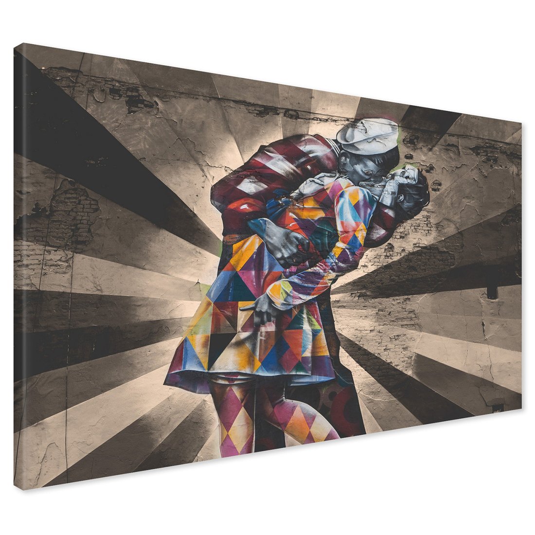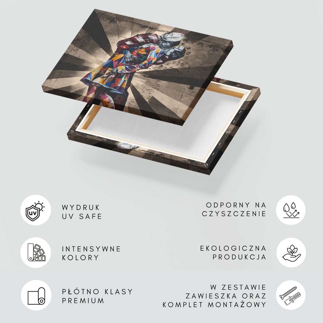 Obraz na płótnie z motywem graffiti, pocałunek, mural to kwintesencja estetyki i trwałości. Dzięki łatwemu montażowi i uniwersalnemu wzornictwu, czyni go idealnym wyborem zarówno do codziennego użytku, jak i na wyrafinowany prezent.