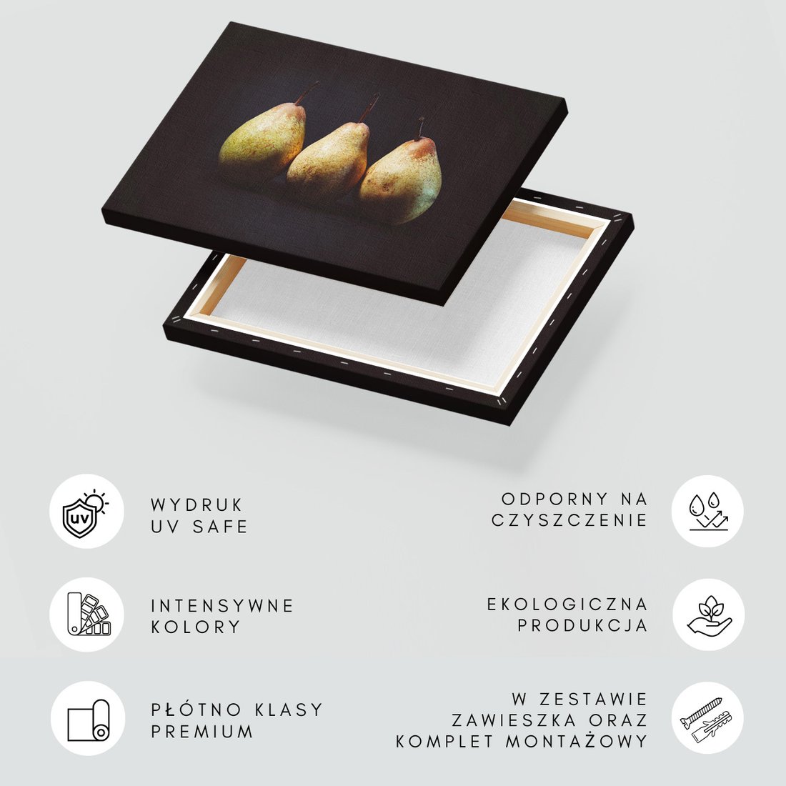 Obraz na płótnie z motywem gruszki, owoce, jedzenie to kwintesencja estetyki i trwałości. Dzięki łatwemu montażowi i uniwersalnemu wzornictwu, czyni go idealnym wyborem zarówno do codziennego użytku, jak i na wyrafinowany prezent.