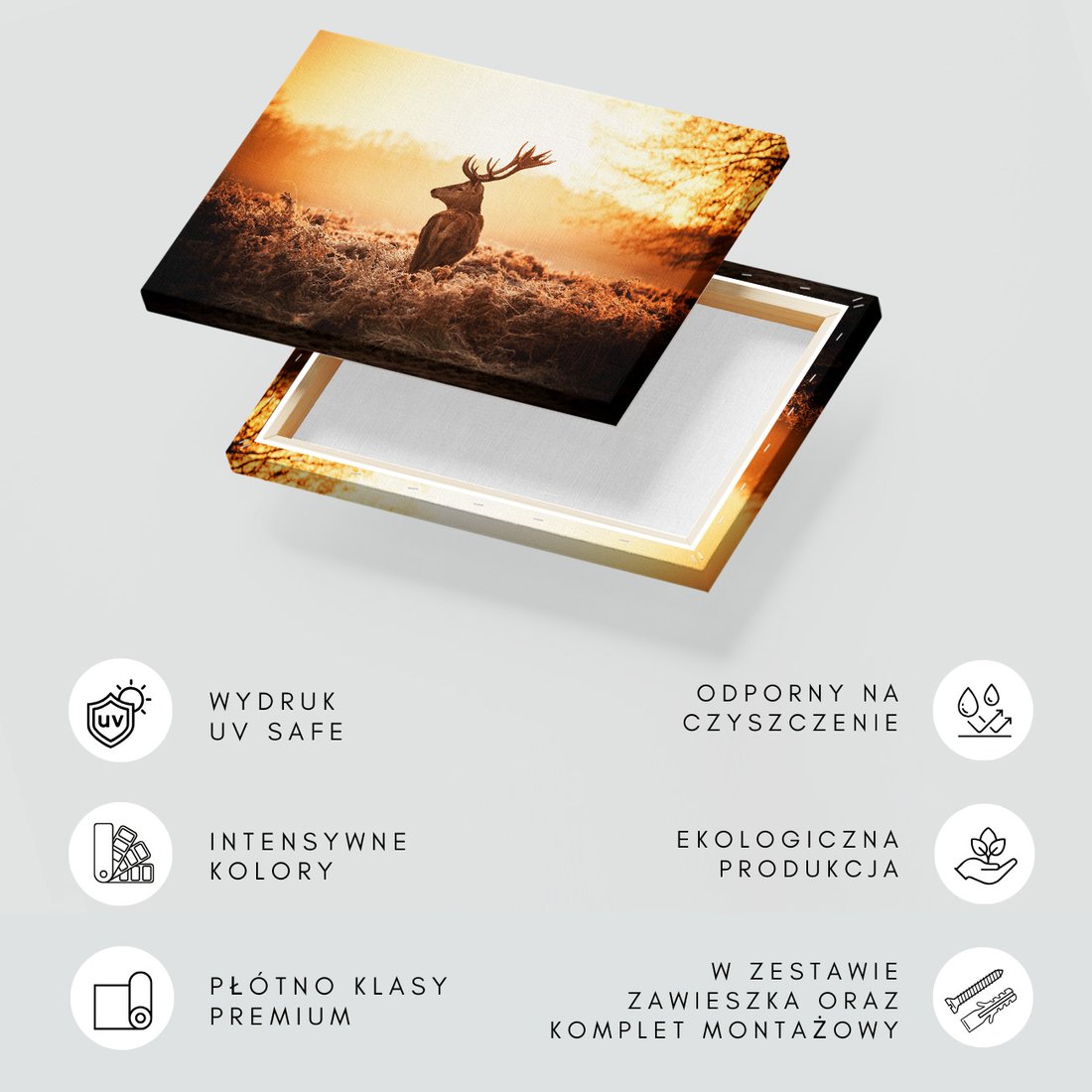 Obraz na płótnie z motywem jeleń, natura, krajobraz to kwintesencja estetyki i trwałości. Dzięki łatwemu montażowi i uniwersalnemu wzornictwu, czyni go idealnym wyborem zarówno do codziennego użytku, jak i na wyrafinowany prezent.