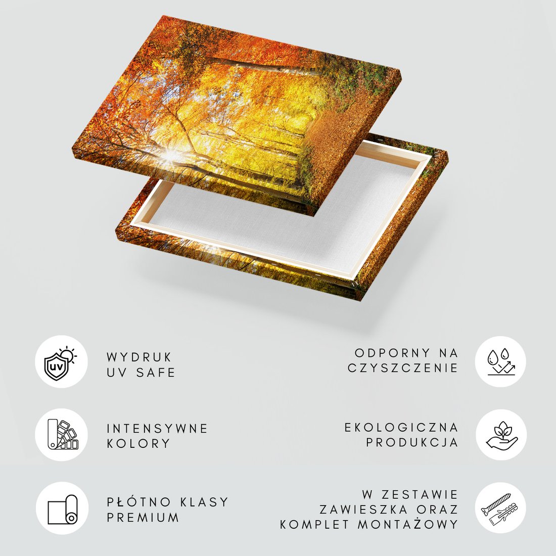 Obraz na płótnie z motywem jesień, las, liście to kwintesencja estetyki i trwałości. Dzięki łatwemu montażowi i uniwersalnemu wzornictwu, czyni go idealnym wyborem zarówno do codziennego użytku, jak i na wyrafinowany prezent.