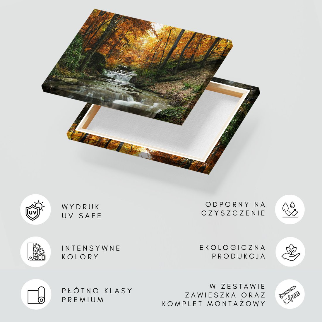 Obraz na płótnie z motywem jesień, wodospad, las to kwintesencja estetyki i trwałości. Dzięki łatwemu montażowi i uniwersalnemu wzornictwu, czyni go idealnym wyborem zarówno do codziennego użytku, jak i na wyrafinowany prezent.