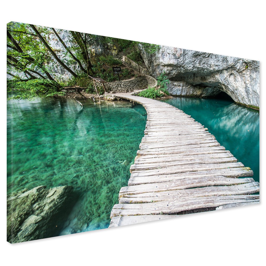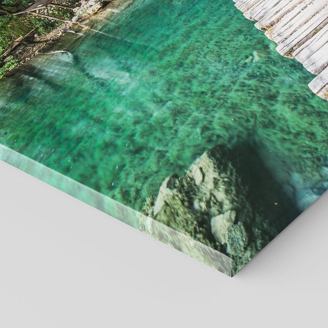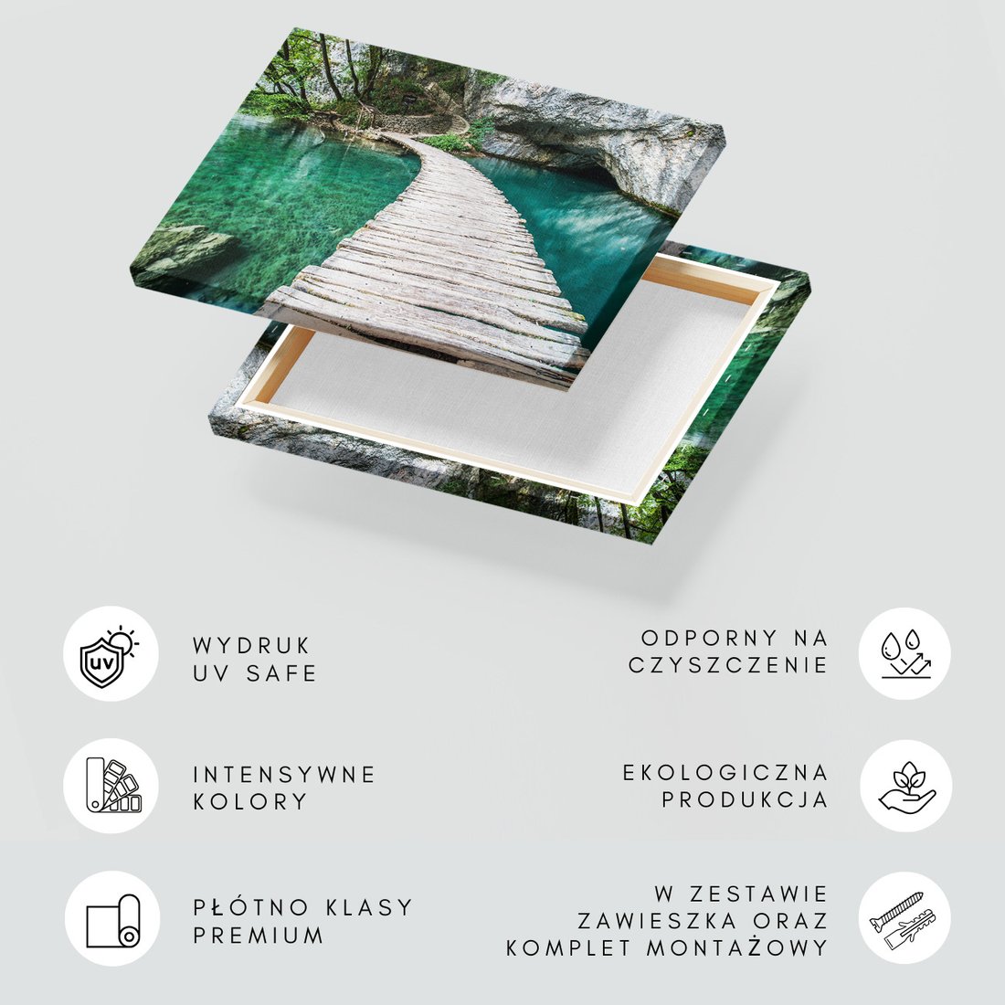 Obraz na płótnie z motywem jezioro, las, mostek to kwintesencja estetyki i trwałości. Dzięki łatwemu montażowi i uniwersalnemu wzornictwu, czyni go idealnym wyborem zarówno do codziennego użytku, jak i na wyrafinowany prezent.