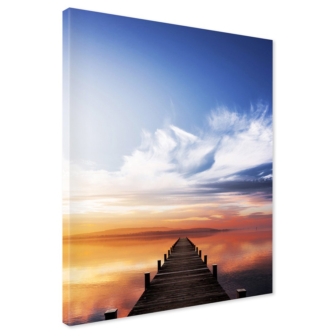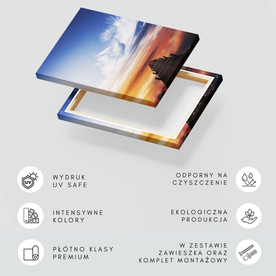 Obraz na płótnie z motywem jezioro, molo, zachód słońca to kwintesencja estetyki i trwałości. Dzięki łatwemu montażowi i uniwersalnemu wzornictwu, czyni go idealnym wyborem zarówno do codziennego użytku, jak i na wyrafinowany prezent.