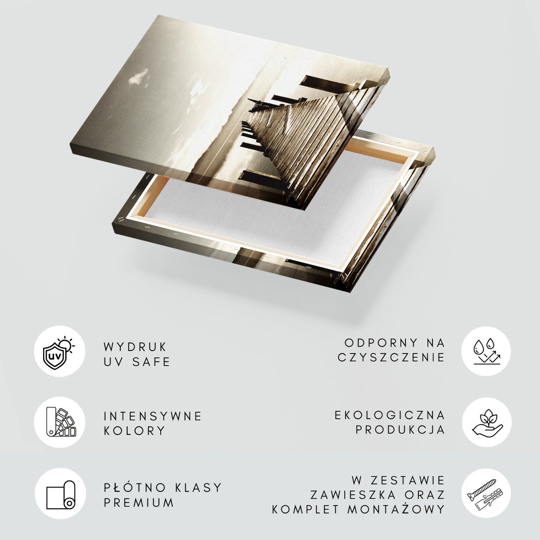Obraz na płótnie z motywem jezioro, pomost, woda to kwintesencja estetyki i trwałości. Dzięki łatwemu montażowi i uniwersalnemu wzornictwu, czyni go idealnym wyborem zarówno do codziennego użytku, jak i na wyrafinowany prezent.