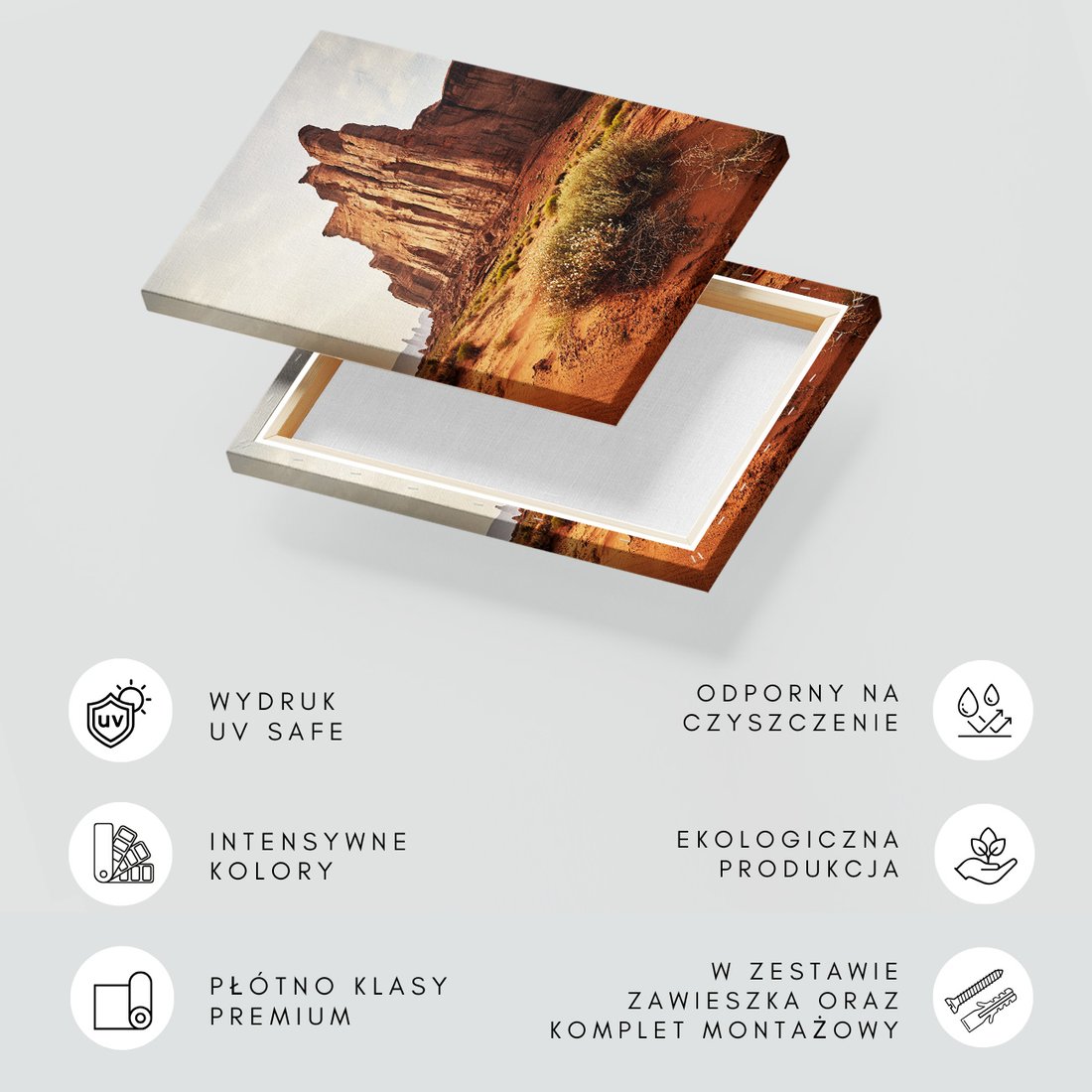Obraz na płótnie z motywem kanion, pustynia, skały to kwintesencja estetyki i trwałości. Dzięki łatwemu montażowi i uniwersalnemu wzornictwu, czyni go idealnym wyborem zarówno do codziennego użytku, jak i na wyrafinowany prezent.