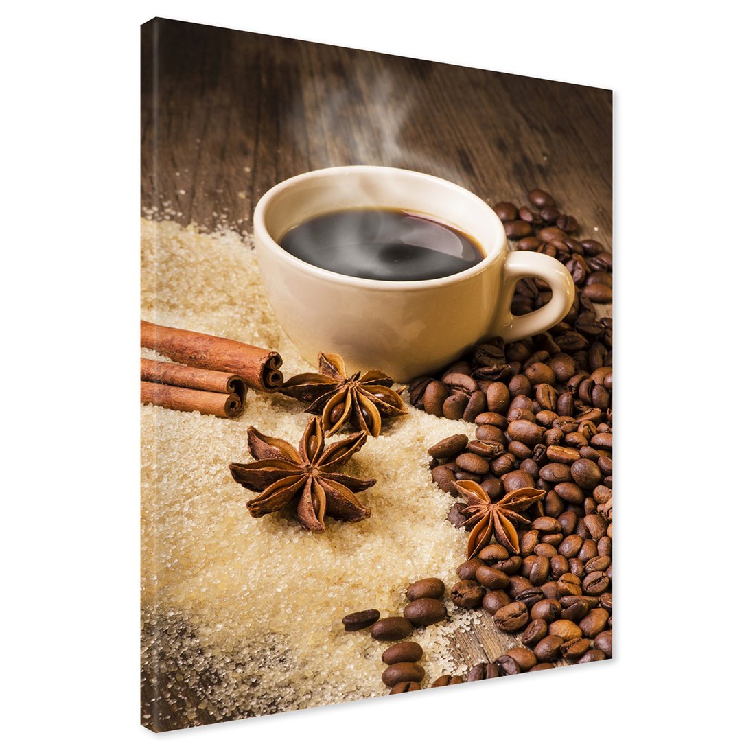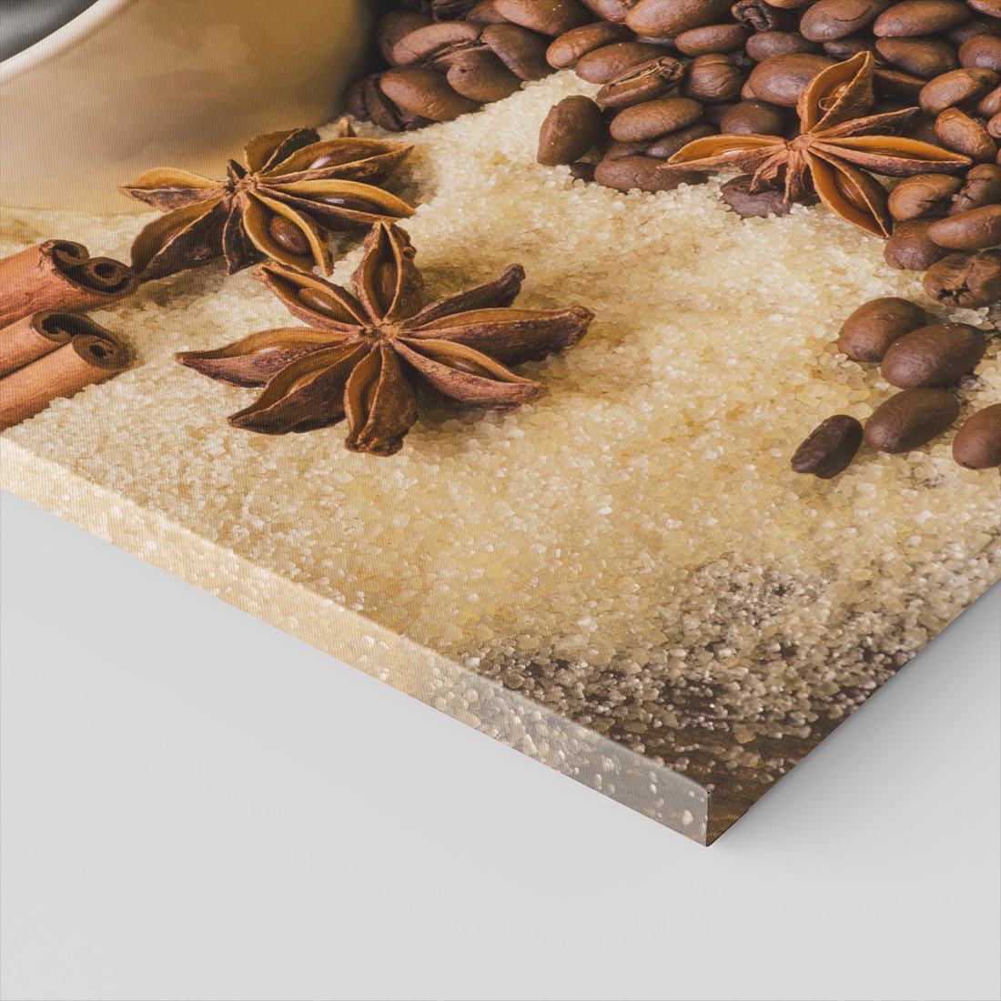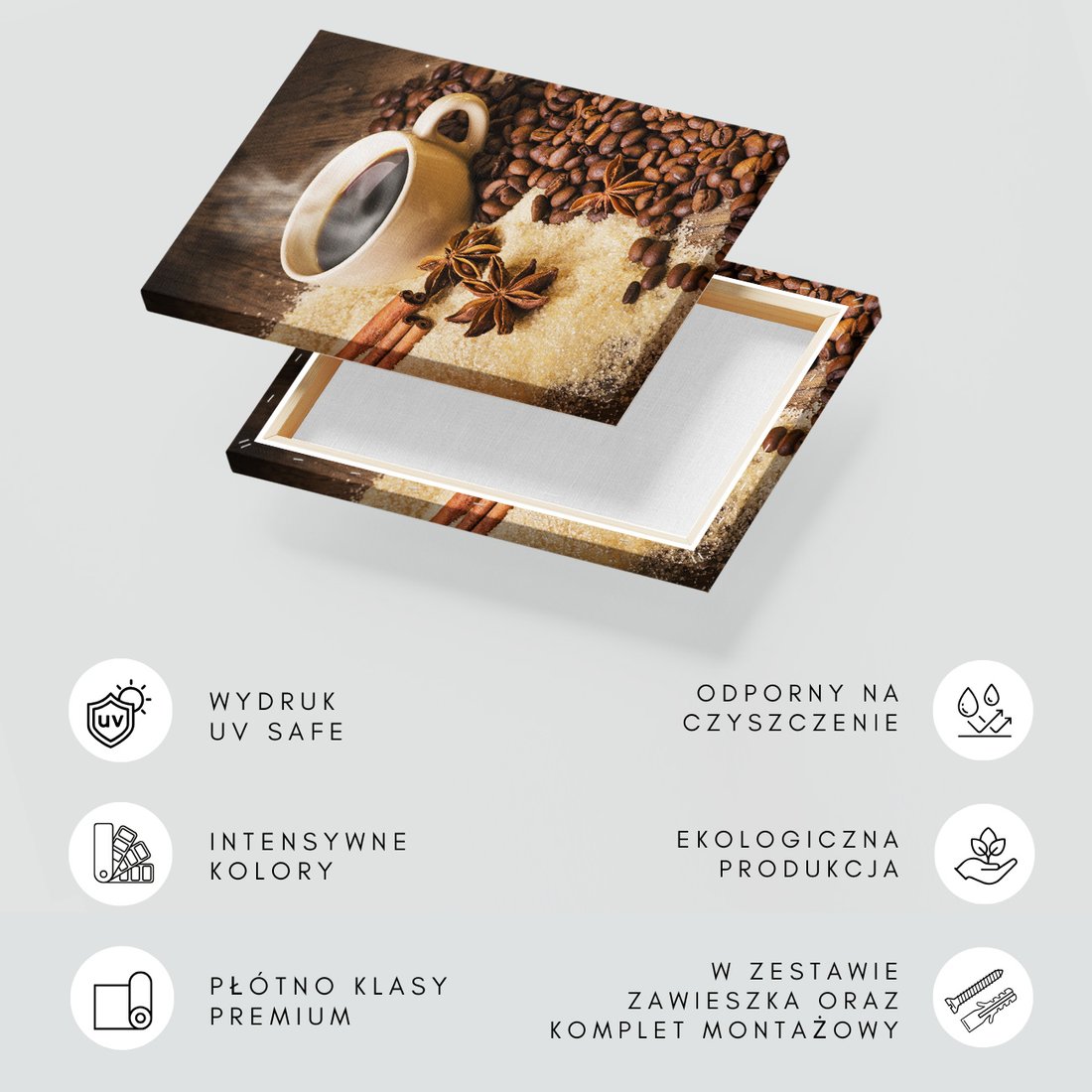 Obraz na płótnie z motywem kawa, ziarna, cynamon to kwintesencja estetyki i trwałości. Dzięki łatwemu montażowi i uniwersalnemu wzornictwu, czyni go idealnym wyborem zarówno do codziennego użytku, jak i na wyrafinowany prezent.