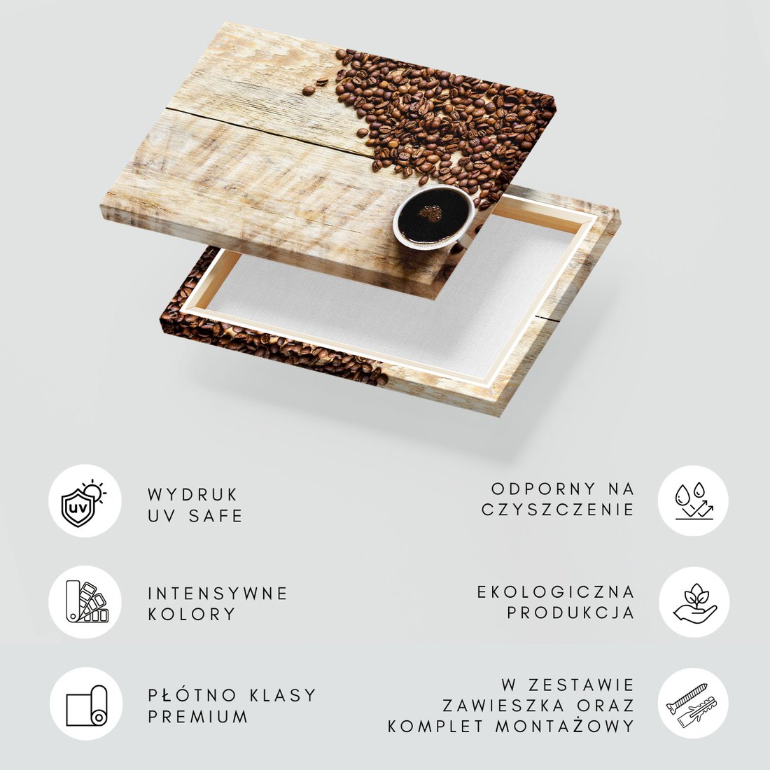 Obraz na płótnie z motywem kawa, ziarna, napój to kwintesencja estetyki i trwałości. Dzięki łatwemu montażowi i uniwersalnemu wzornictwu, czyni go idealnym wyborem zarówno do codziennego użytku, jak i na wyrafinowany prezent.