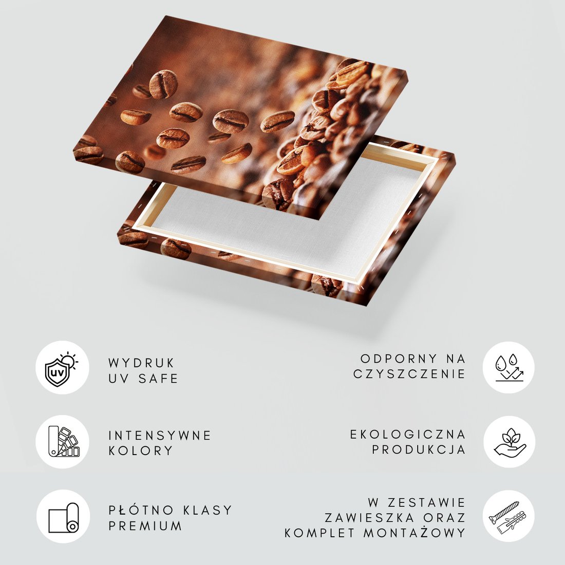Obraz na płótnie z motywem kawa, ziarna, napój to kwintesencja estetyki i trwałości. Dzięki łatwemu montażowi i uniwersalnemu wzornictwu, czyni go idealnym wyborem zarówno do codziennego użytku, jak i na wyrafinowany prezent.