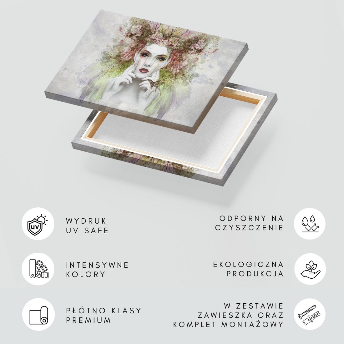 Obraz na płótnie z motywem kobieta, kwiaty, abstrakcja to kwintesencja estetyki i trwałości. Dzięki łatwemu montażowi i uniwersalnemu wzornictwu, czyni go idealnym wyborem zarówno do codziennego użytku, jak i na wyrafinowany prezent.