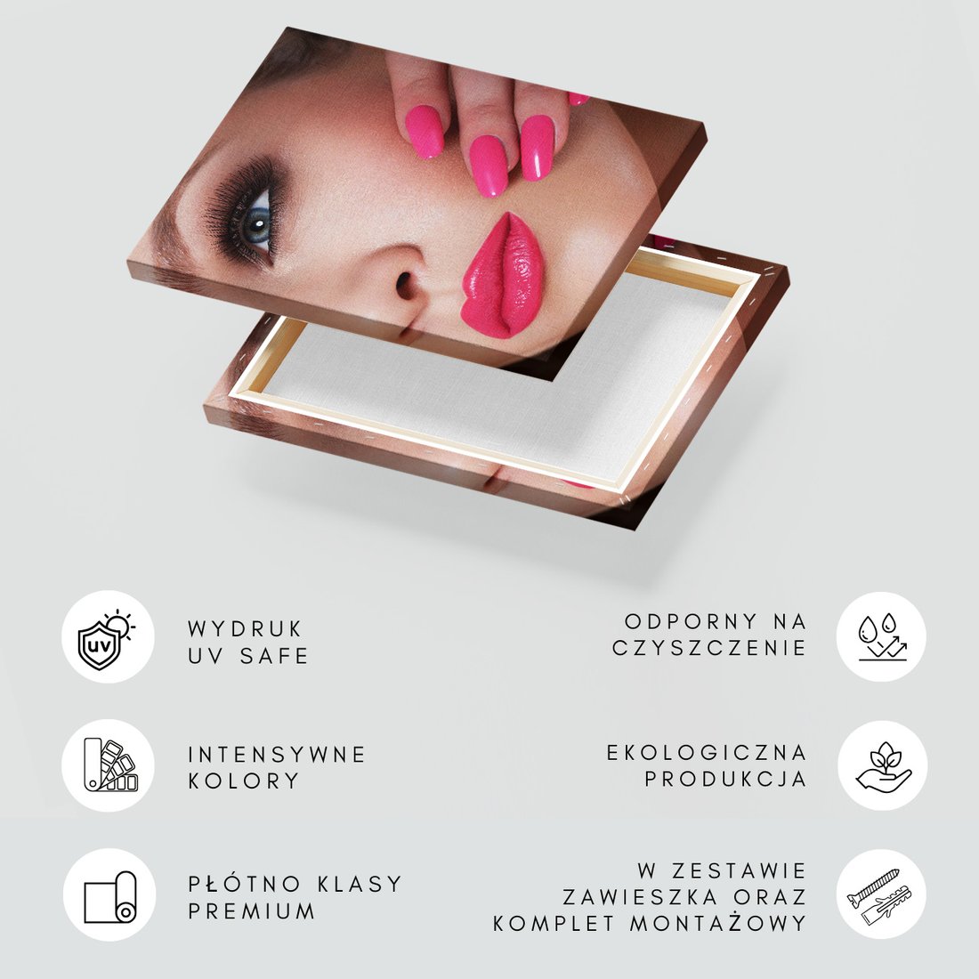 Obraz na płótnie z motywem kobieta, oko, usta to kwintesencja estetyki i trwałości. Dzięki łatwemu montażowi i uniwersalnemu wzornictwu, czyni go idealnym wyborem zarówno do codziennego użytku, jak i na wyrafinowany prezent.