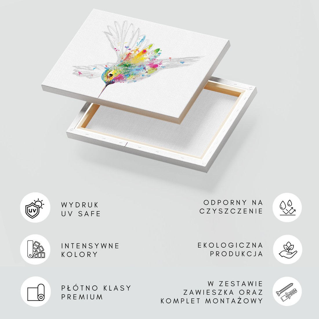 Obraz na płótnie z motywem koliber, ptak, abstrakcja to kwintesencja estetyki i trwałości. Dzięki łatwemu montażowi i uniwersalnemu wzornictwu, czyni go idealnym wyborem zarówno do codziennego użytku, jak i na wyrafinowany prezent.