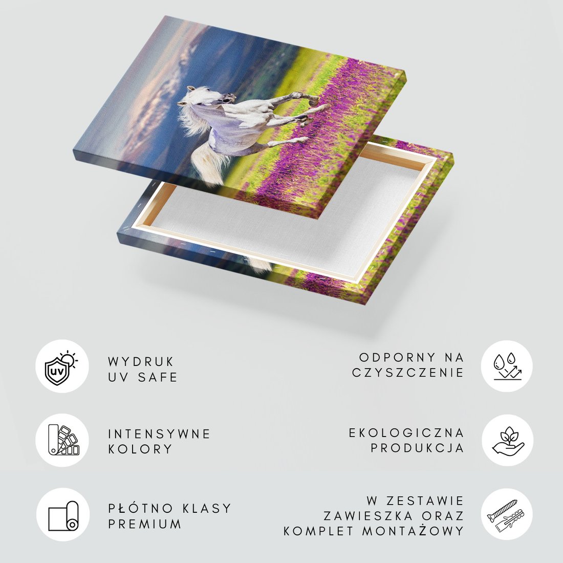 Obraz na płótnie z motywem koń, natura, góry to kwintesencja estetyki i trwałości. Dzięki łatwemu montażowi i uniwersalnemu wzornictwu, czyni go idealnym wyborem zarówno do codziennego użytku, jak i na wyrafinowany prezent.