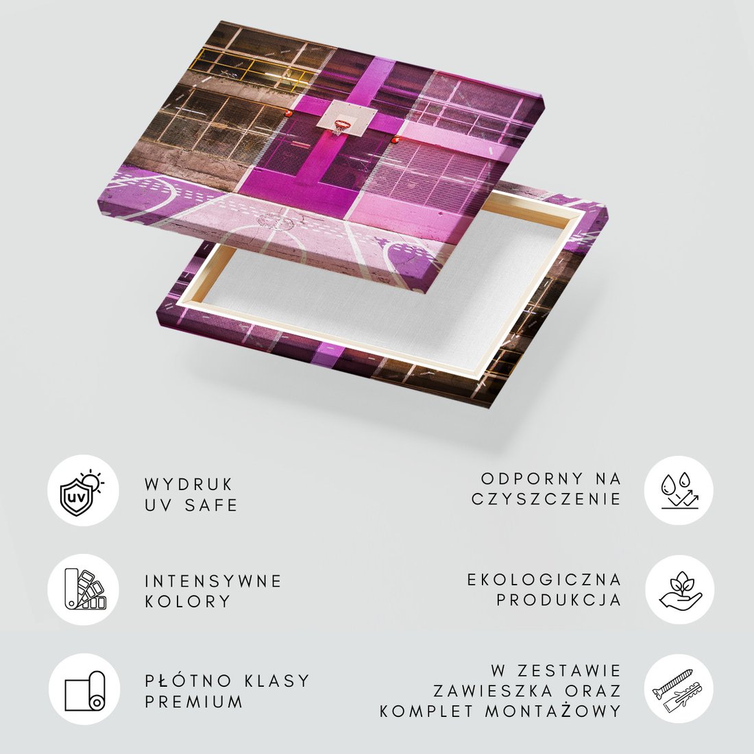 Obraz na płótnie z motywem koszykówka, miasto, sport to kwintesencja estetyki i trwałości. Dzięki łatwemu montażowi i uniwersalnemu wzornictwu, czyni go idealnym wyborem zarówno do codziennego użytku, jak i na wyrafinowany prezent.