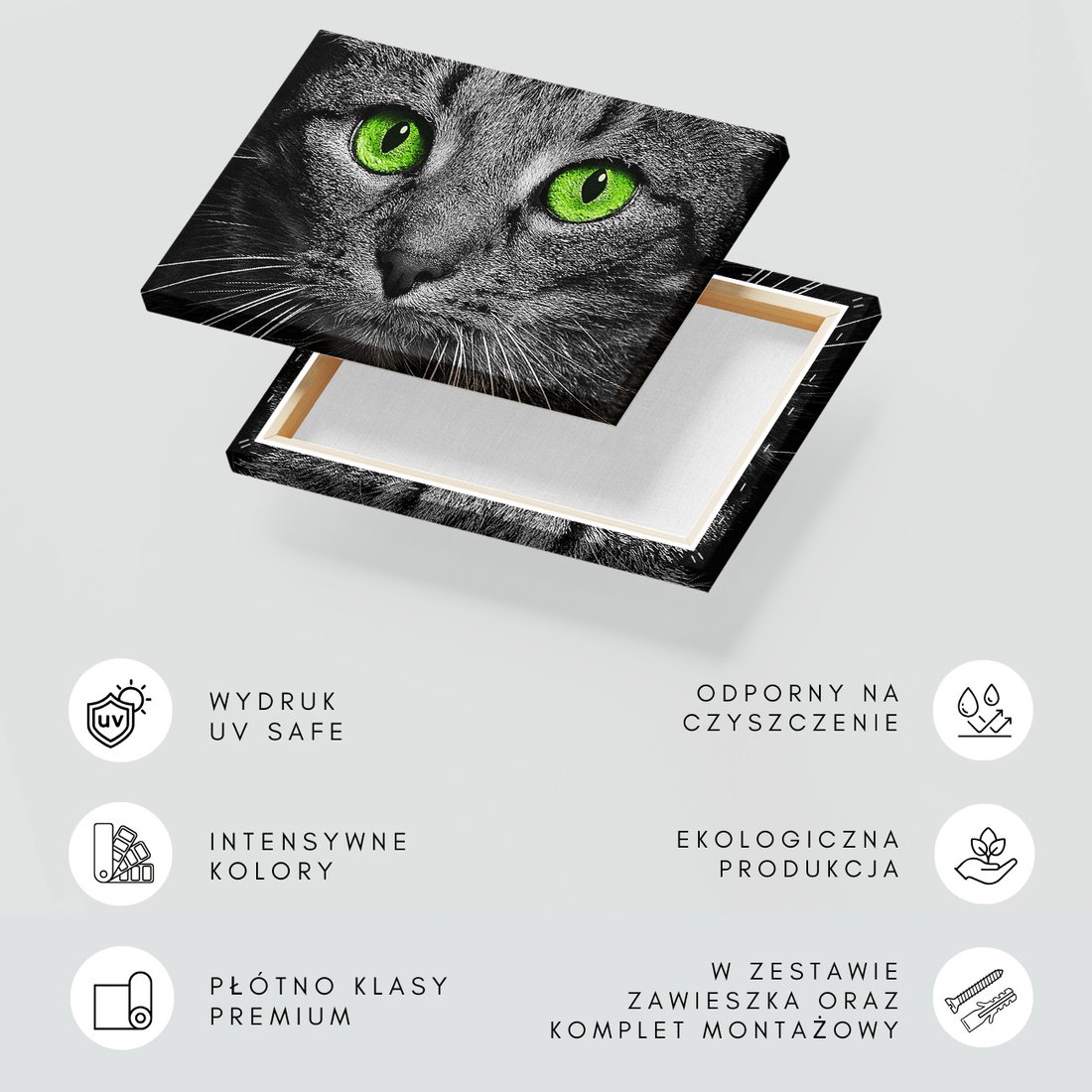 Obraz na płótnie z motywem kot, oczy, zbliżenie to kwintesencja estetyki i trwałości. Dzięki łatwemu montażowi i uniwersalnemu wzornictwu, czyni go idealnym wyborem zarówno do codziennego użytku, jak i na wyrafinowany prezent.